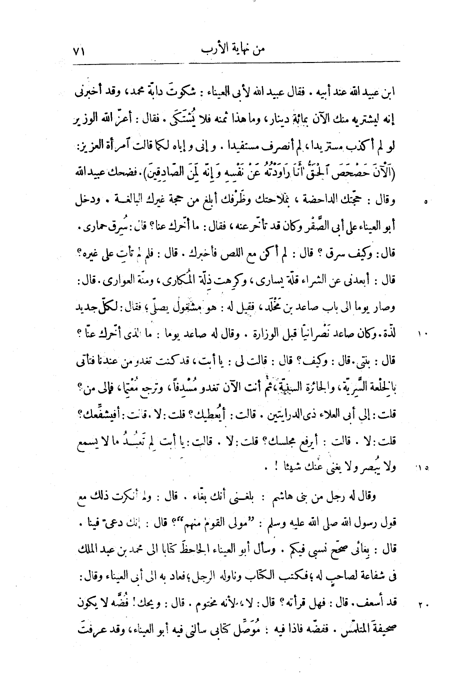(الآن حصحص الحقّ أنا راودته عن نفسه وإنّه لمن الصّادقين) . فضحك عبيد الله وقال: حجّتك الداحضة، بملاحتك وظرفك أبلغ من حجة غيرك البالغة. ودخل أبو العيناء على أبى الصّقر وكان قد تأخّر عنه، فقال: ما أخّرك عنا؟ قال: سرق حمارى.