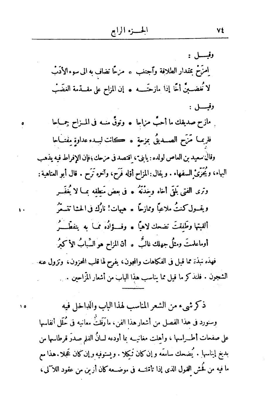 وقال سعيد بن العاص لولده: يا بنىّ، اقتصد في مزحك؛ فإن الإفراط فيه يذهب البهاء، ويجزّىء السفهاء. ويقال: المزاح أوّله فرح، وآخره ترح. قال أبو العتاهية: