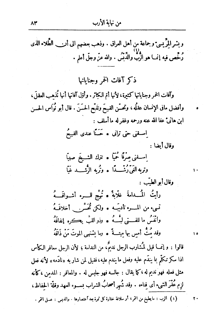 وبشر المرّيسىّ وجماعة من أهل العراق. وذهب بعضهم الى أن الطّلاء الذى رخّص فيه إنما هو الرّبّ «1» والدّبس. والله عزّوجلّ أعلم.