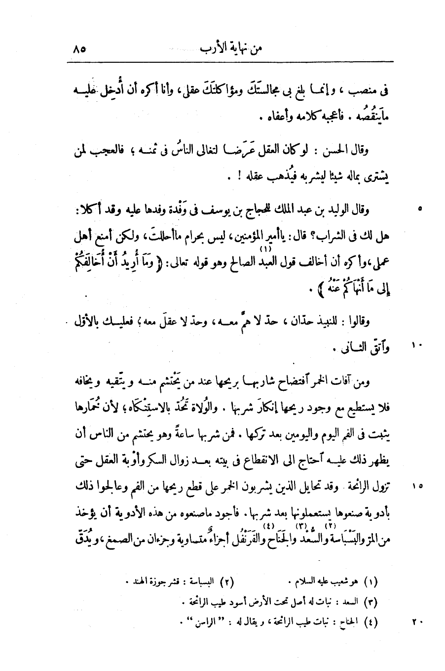 ومن آفات الخمر افتضاح شاربها بريحها عند من يحتشم منه ويتّقيه ويخافه فلا يستطيع مع وجود ريحها إنكار شربها. والولاة تحدّ بالاستنكاه؛ لأن خمارها يثبت في الفم اليوم واليومين بعد تركها. فمن شربها ساعة وهو يحتشم من الناس أن يظهر ذلك عليه احتاج الى الانقطاع في بيته بعد زوال السكر وأوبة العقل حتى تزول الرائحة. وقد تحايل الذين يشربون الخمر على قطع ريحها من الفم وعالجوا ذلك بأدوية صنعوها يستعملونها بعد شربها. فأجود ما صنعوه من هذه الأدوية أن يؤخذ من المرّ والبسباسة «2» والسّعد «3» والجناح «4» والقرنفل أجزاء متساوية وجزءان من الصمغ، ويدقّ