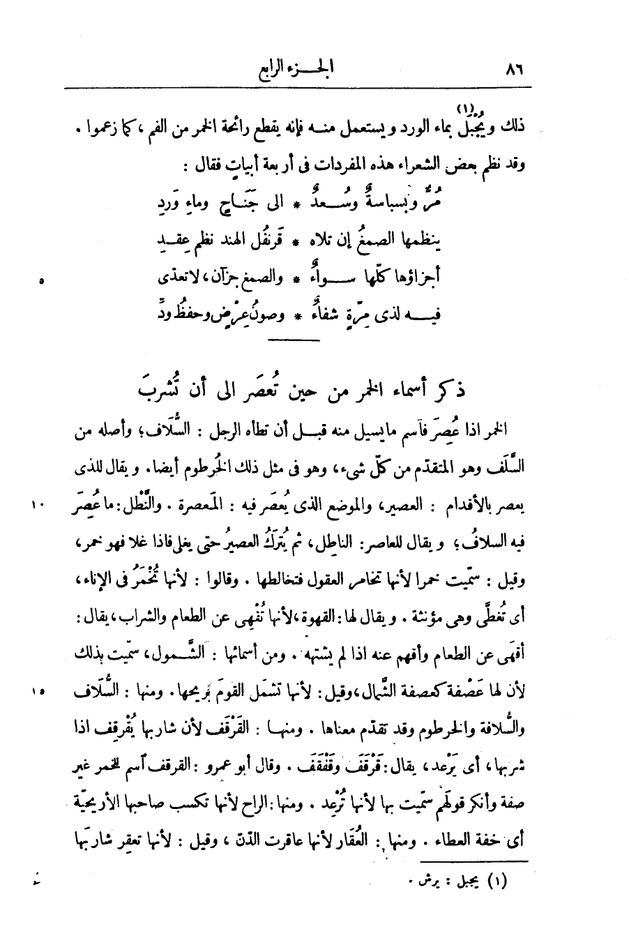 أقهى عن الطعام وأقهم عنه اذا لم يشتهه. ومن أسمائها: الشّمول، سمّيت بذلك لأن لها عصفة كعصفة الشّمال، وقيل: لأنها تشمل القوم بريحها. ومنها: السّلاف والسّلافة والخرطوم وقد تقدّم معناها. ومنها: القرقف لأن شاربها يقرقف اذا شربها، أى يرعد، يقال: قرقف وقفقف. وقال أبو عمرو: القرقف اسم للخمر غير صفة وأنكر قولهم سمّيت بها لأنها ترعد. ومنها: الراح لأنها تكسب صاحبها الأريحيّة أى خفة العطاء. ومنها: العقار لأنها عاقرت الدّنّ، وقيل: لأنها تعقر شاربها