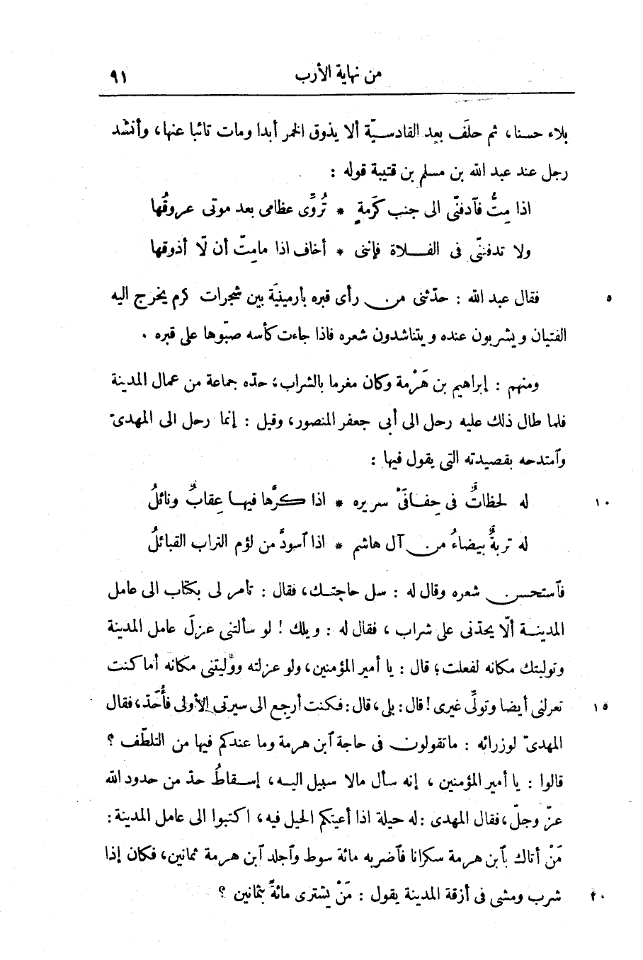 فاستحسن شعره وقال له: سل حاجتك، فقال: تأمر لى بكتاب الى عامل المدينة ألّا يحدّنى على شراب، فقال له: ويلك! لو سألتنى عزل عامل المدينة وتوليتك مكانه لفعلت؛ قال: يا أمير المؤمنين، ولو عزلته ووليتنى مكانه أما كنت تعرلنى أيضا وتولّى غيرى! قال: بلى، قال: فكنت أرجع الى سيرتى الأولى فأحدّ، فقال المهدىّ لوزرائه: ما تقولون في حاجة ابن هرمة وما عندكم فيها من التلطّف؟