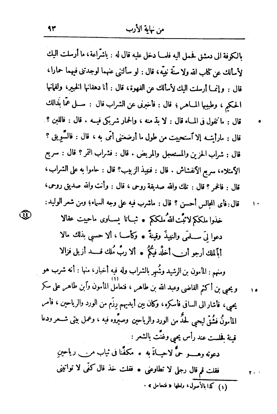 بالكوفة الى دمشق فحمل اليه فلما دخل عليه قال له: يا شرّاعة، ما أرسلت اليك لأسألك عن كتاب الله ولا سنّة نبيّه، قال: لو سألتنى عنهما لوجدتنى فيهما حمارا، قال: وإنما أرسلت اليك لأسألك عن القهوة، قال: أنا دهقانها الخبير، ولقمانها الحكيم، وطبيبها الماهر؛ قال: فأخبرنى عن الشراب قال: سل عمّا بدا لك قال: ما تقول في الماء قال: لا بدّ منه، والحمار شريكى فيه. قال: فاللبن؟