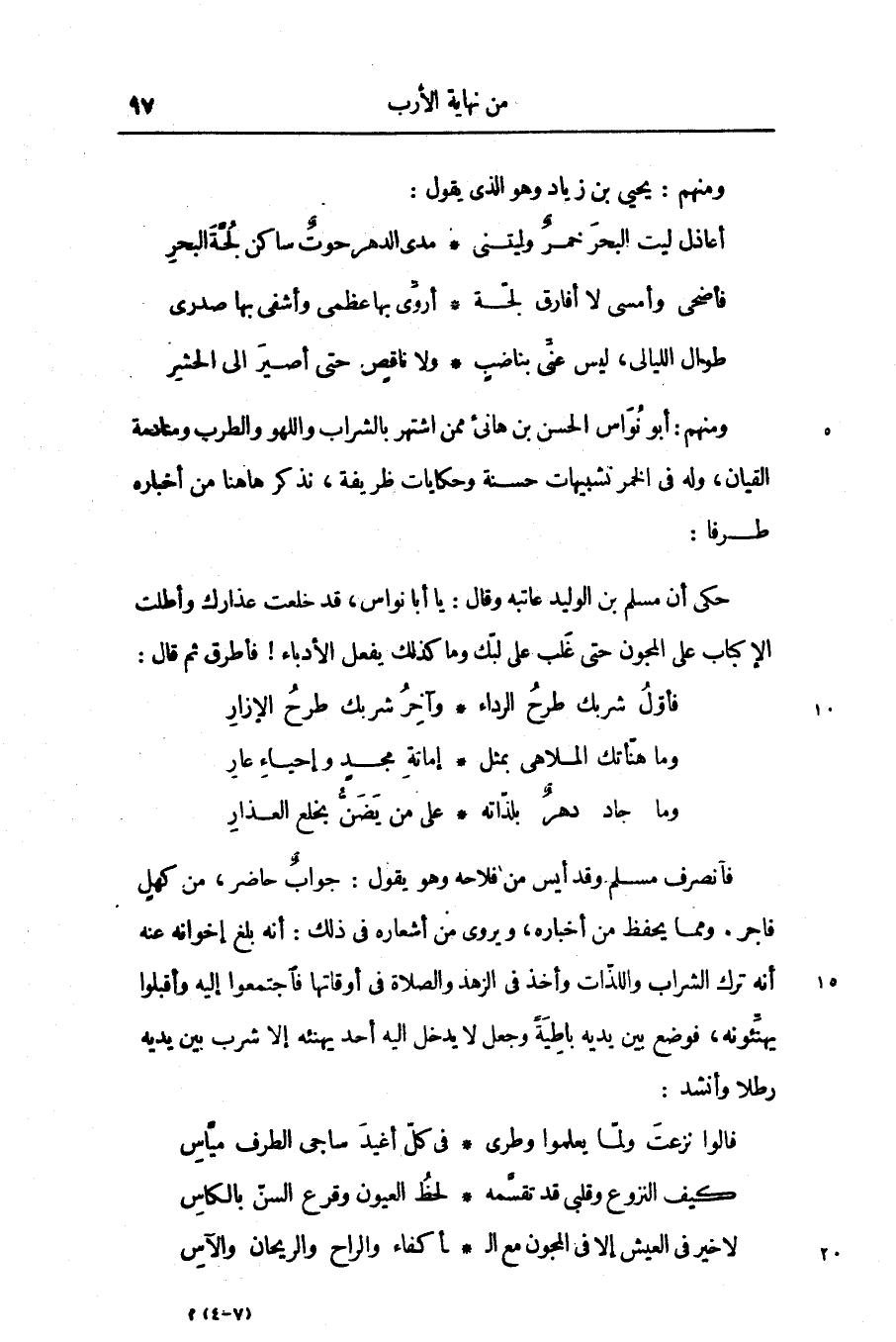 فانصرف مسلم وقد أيس من فلاحه وهو يقول: جواب حاضر، من كهل فاجر. ومما يحفظ من أخباره، ويروى من أشعاره في ذلك: أنه بلغ إخوانه عنه أنه ترك الشراب واللذّات وأخذ في الزهد والصلاة في أوقاتها فاجتمعوا إليه وأقبلوا يهنّئونه، فوضع بين يديه باطية وجعل لا يدخل اليه أحد يهنئه إلا شرب بين يديه رطلا وأنشد: