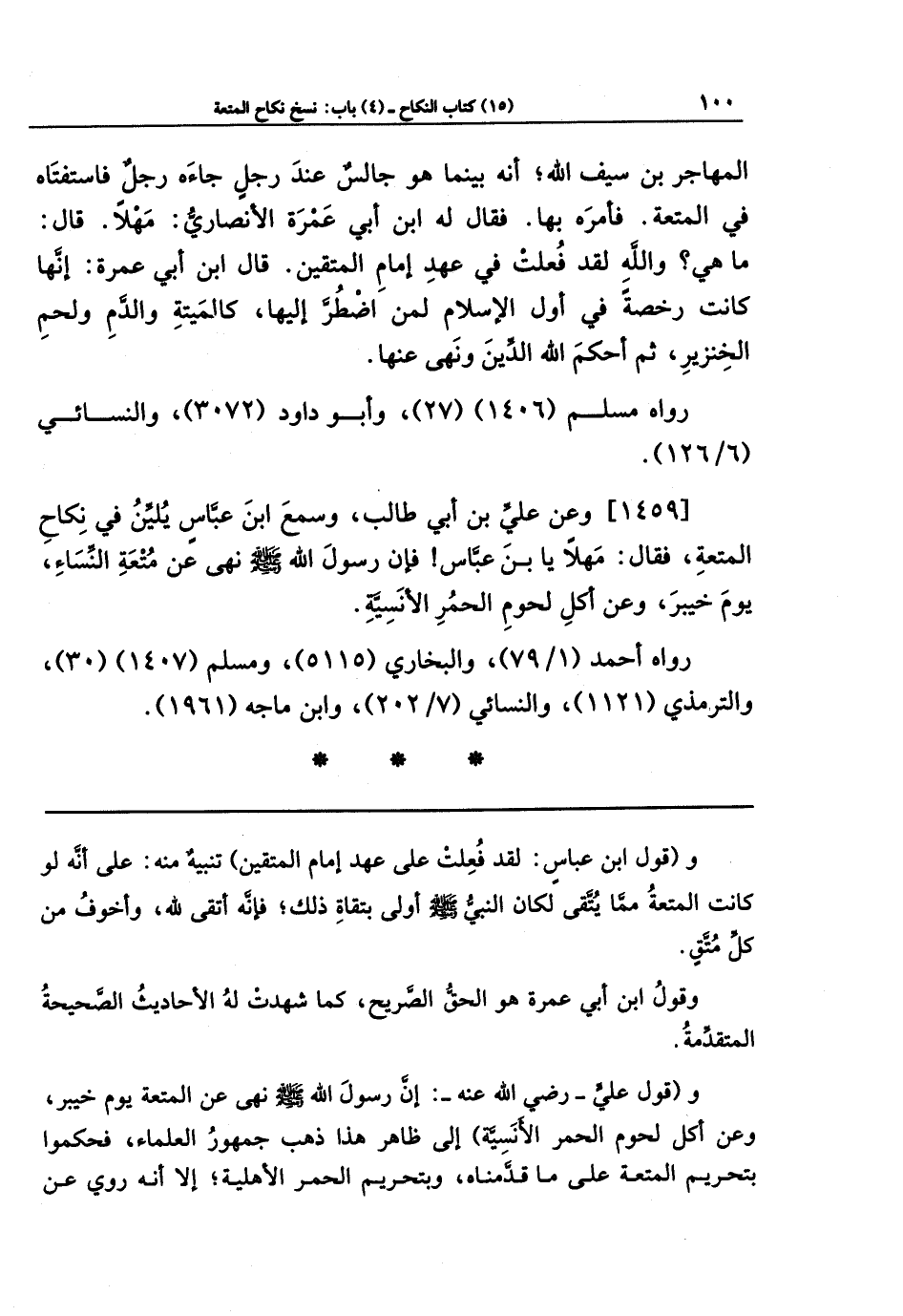 المُهَاجِرِ بنِ سَيفِ اللَّهِ أَنَّهُ بَينَما هُوَ جَالِسٌ عِندَ رَجُلٍ جَاءَهُ رَجُلٌ فَاستَفتَاهُ فِي المُتعَةِ، فَأَمَرَهُ بِهَا فَقَالَ لَهُ ابنُ أَبِي عَمرَةَ الأَنصَارِيُّ: مَهلًا قَالَ: مَا هِيَ؟ وَاللَّهِ لَقَد فُعِلَت فِي عَهدِ إِمَامِ المُتَّقِينَ. قَالَ ابنُ أَبِي عَمرَةَ: إِنَّهَا كَانَت رُخصَةً فِي أَوَّلِ الإِسلَامِ لِمَن اضطُرَّ إِلَيهَا كَالمَيتَةِ، وَالدَّمِ، وَلَحمِ الخِنزِيرِ، ثُمَّ أَحكَمَ اللَّهُ الدِّينَ، وَنَهَى عَنهَا.