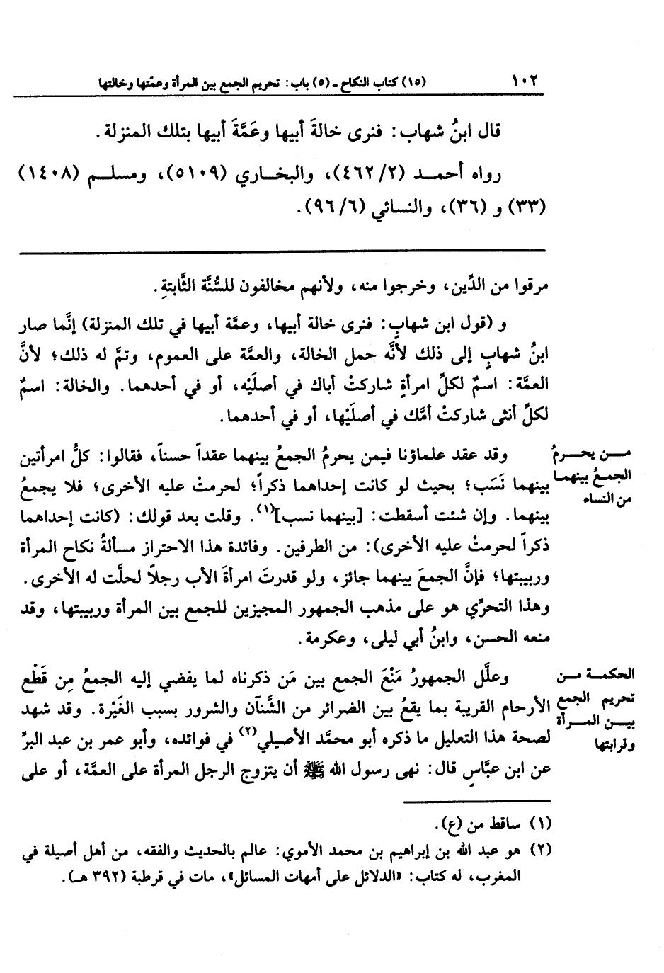 وقد عقد علماؤنا فيمن يحرمُ الجمع بينهما عقدًا حسنًا، فقالوا: كل امرأتين بينهما نسب؛ بحيث لو كانت إحداهما ذكرًا لحرمت عليه الأخرى، فلا يجمع بينهما. وإن شئت أسقطَّت: بينهما نسب (¬1).