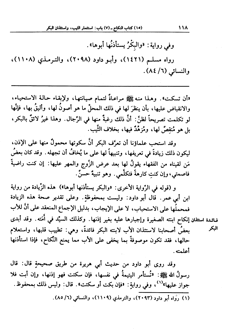 و(قوله في الرواية الأخرى: والبكر يستأذنها أبوها) هذه الزيادة من رواية ابن أبي عمر. قال أبو داود: وليست بمحفوظة. وعلى تقدير صحة هذه الزيادة، فمحملُها على الاستحباب، لا على الإيجاب؛ بدليل الإجماع المنعقد على أن للأب إنكاح ابنته الصغيرة وإجبارها عليه بغير إذنها. وكذلك السيّد في أَمَتِه. وقد أبدى بعض أصحابنا لاستئذان الأب لابنته البكر فائدة، وهي: تطييب قلبها، واستعلام حالها، فقد تكون موصوفةً بما يخفى على الأب مما يمنع النكاح، فإذا استأذنها أعلمته.