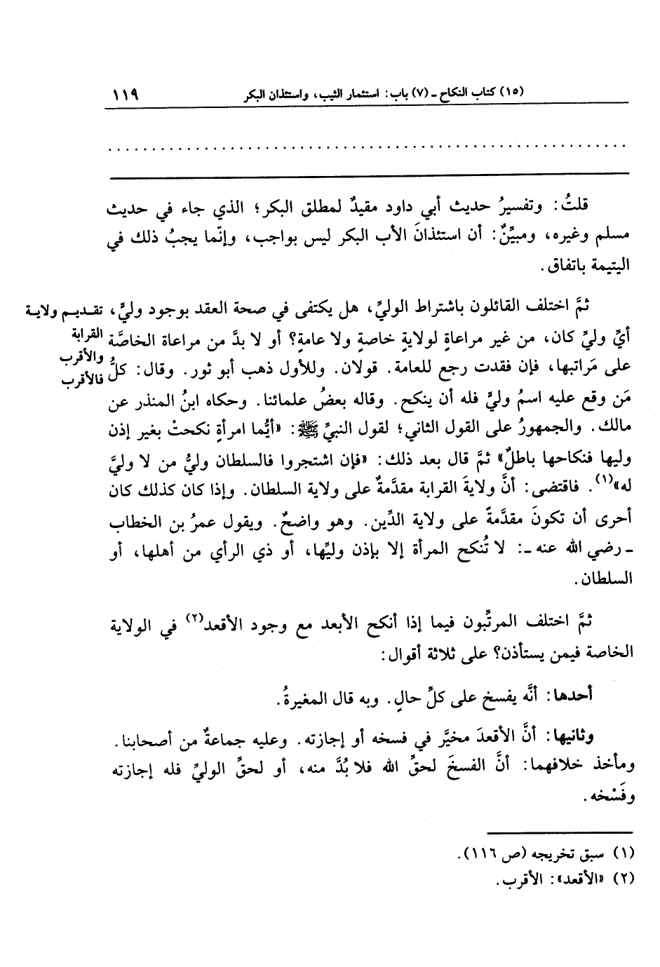 قلت: وتفسير حديث أبي داود مقيدٌ لمطلق البكر الذي جاء في حديث مسلم وغيره، ومبيّن أن استئذان الأب البكر ليس بواجب، وإنما يجب ذلك في اليتيمة باتفاق.