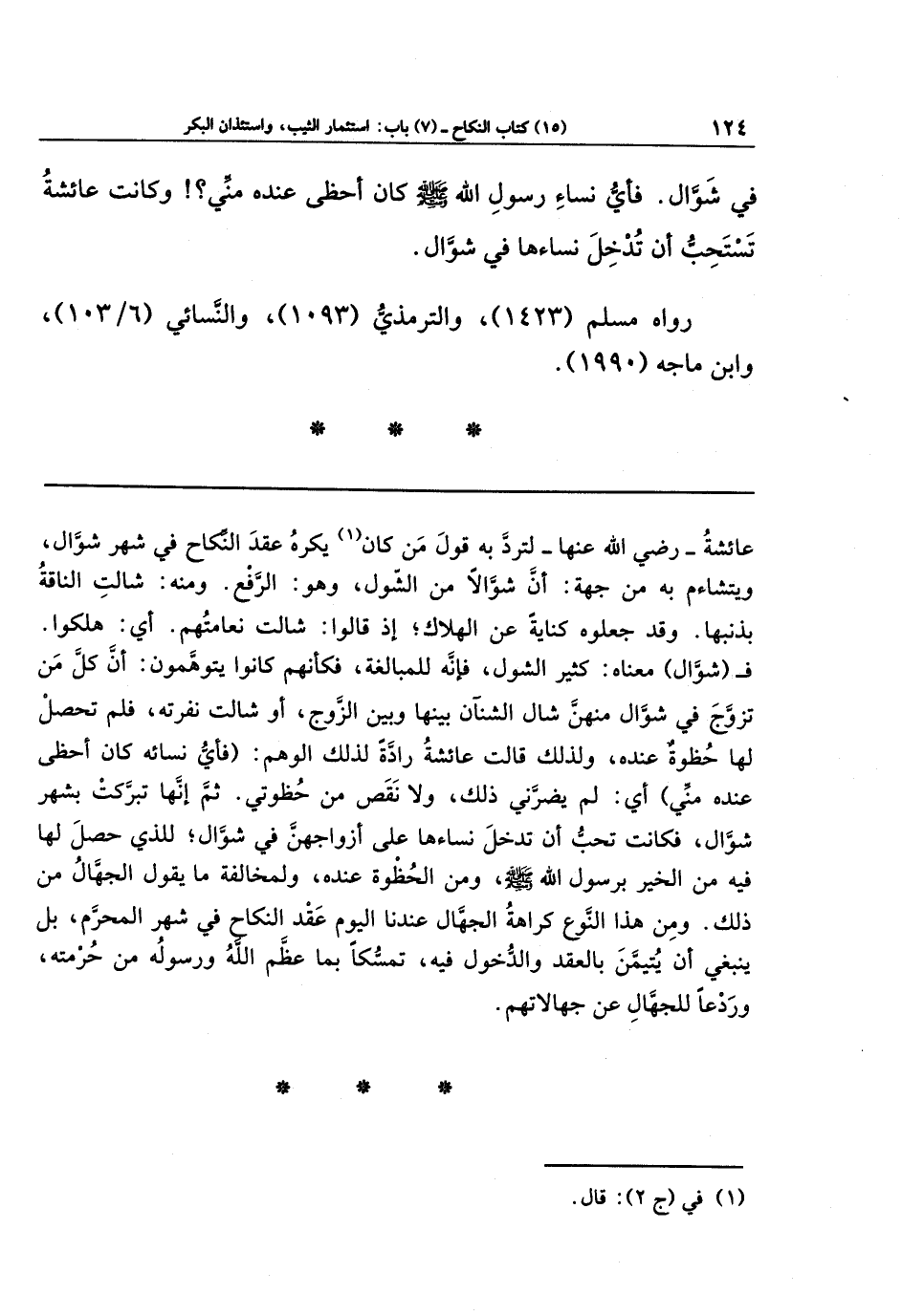 فـ (شوَّال) معناه: كثير الشول، فإنَّه للمبالغة، فكأنهم كانوا يتوهّمون أنَّ كلَّ مَن تزوّج في شوَّال منهن شال الشنآن بينها وبين الزوج، أو شالت نفرته، فلم تحصل لها حظوة عنده، ولذلك قالت عائشة رادَّةً لذلك الوهم: (فأي نسائه كان أحظى عنده مني) أي: لم يضرّني ذلك، ولا نقص من حظوتي. ثم إنها تبرّكت بشهر شوَّال، فكانت تحب أن تُدخل نساءها على أزواجهنّ في شوّال؛ للذي حصل لها فيه من الخير برسول الله صلى الله عليه وسلم ومن الحظوة عنده، ولمخالفة ما يقول الجُهَّال من ذلك.