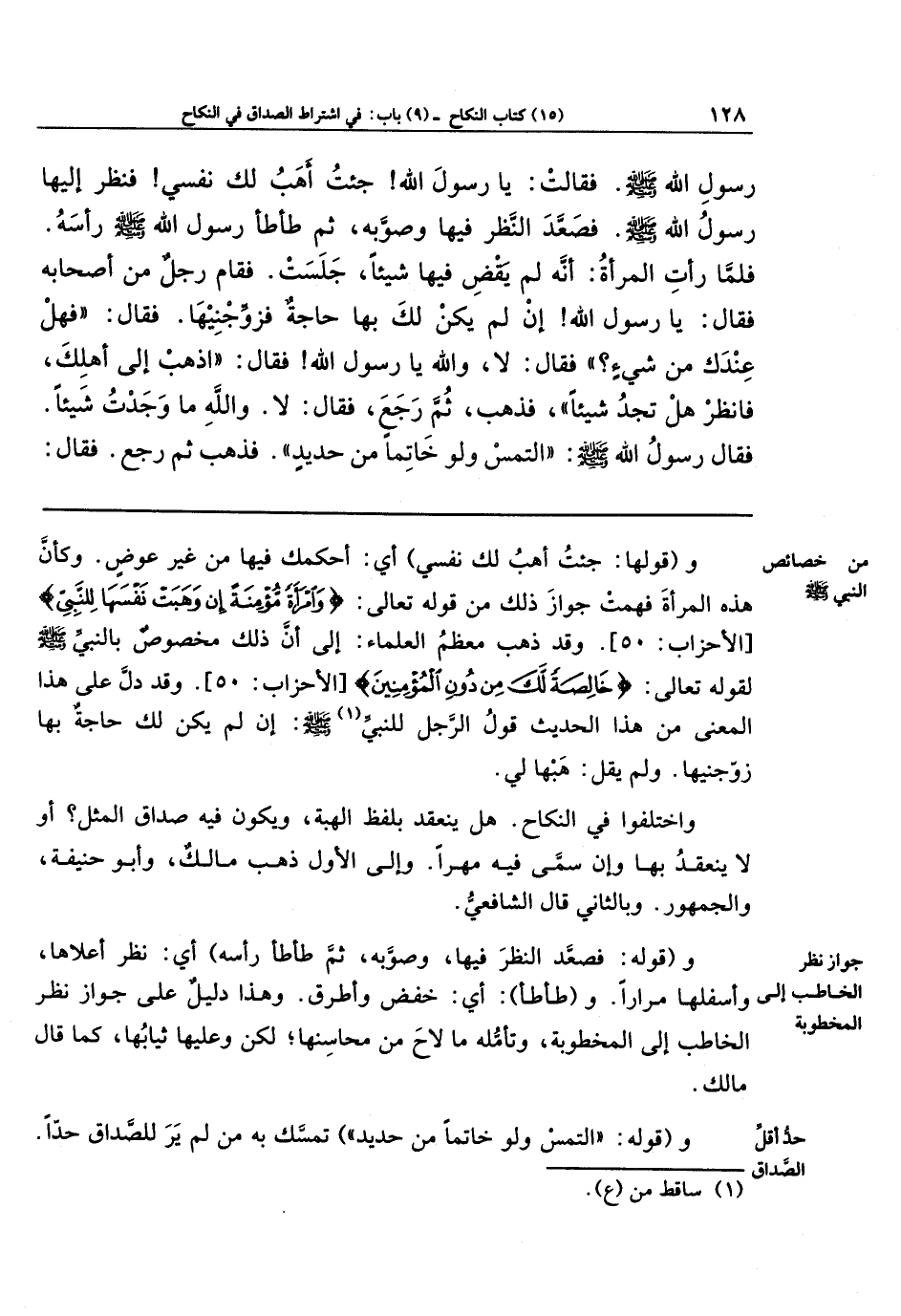 رَسُولِ اللَّهِ صَلَّى اللَّهُ عَلَيهِ وَسَلَّمَ فَقَالَت: يَا رَسُولَ اللَّهِ جِئتُ أَهَبُ لَكَ نَفسِي، فَنَظَرَ إِلَيهَا رَسُولُ اللَّهِ صَلَّى اللَّهُ عَلَيهِ وَسَلَّمَ، فَصَعَّدَ النَّظَرَ فِيهَا وَصَوَّبَهُ، ثُمَّ طَأطَأَ رَسُولُ اللَّهِ صَلَّى اللَّهُ عَلَيهِ وَسَلَّمَ رَأسَهُ، فَلَمَّا رَأَت المَرأَةُ أَنَّهُ لَم يَقضِ فِيهَا شَيئًا جَلَسَت فَقَامَ رَجُلٌ مِن أَصحَابِهِ فَقَالَ: يَا رَسُولَ اللَّهِ إِن لَم يَكُن لَكَ بِهَا حَاجَةٌ فَزَوِّجنِيهَا فَقَالَ: فَهَل عِندَكَ مِن شَيءٍ؟ فَقَالَ: لَا وَاللَّهِ يَا رَسُولَ اللَّهِ فَقَالَ: اذهَب إِلَى أَهلِكَ، فَانظُر هَل تَجِدُ شَيئًا؟ فَذَهَبَ، ثُمَّ رَجَعَ فَقَالَ: لَا وَاللَّهِ مَا وَجَدتُ شَيئًا فَقَالَ رَسُولُ اللَّهِ صَلَّى اللَّهُ عَلَيهِ وَسَلَّمَ: التمس وَلَو خَاتِمًا مِن حَدِيدٍ فَذَهَبَ، ثُمَّ رَجَعَ فَقَالَ: