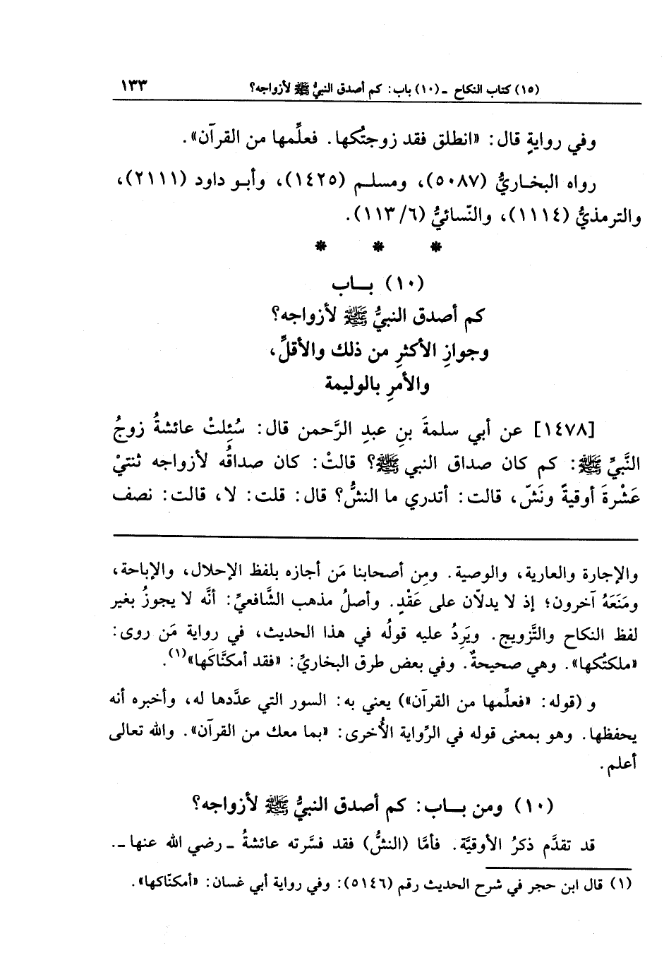 (1426) [1478] عَن أَبِي سَلَمَةَ بنِ عَبدِ الرَّحمَنِ قَالَ: سَئَلتُ عَائِشَةَ زَوجَ النَّبِيِّ صَلَّى اللَّهُ عَلَيهِ وَسَلَّمَ كَم كَانَ صَدَاقُ النبي صَلَّى اللَّهُ عَلَيهِ وَسَلَّمَ؟ قَالَت: كَانَ صَدَاقُهُ لِأَزوَاجِهِ ثِنتَي عَشرَةَ أُوقِيَّةً وَنَشًّ. قَالَت: أَتَدرِي مَا النَّشُّ؟ قَالَ: قُلتُ: لَا. قَالَت: نِصفُ