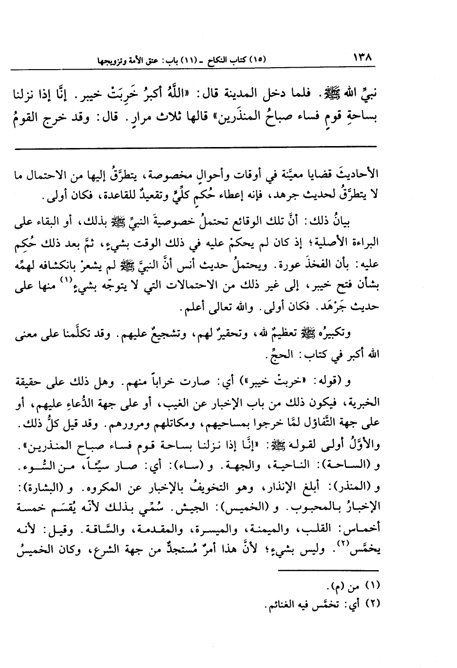 و(الساحة): الناحية، والجهة. و (ساء): أي: صار سيئًا؛ من السُّوء. و (المنذر): أبلغ الإنذار، وهو التخويف بالإخبار عن المكروه. و (البشارة): الإخبار بالمحبوب. و (الخميس): الجيش؛ سُمِّي بذلك؛ لأنه يقسم خمسة أخماس: القلب، والميمنة، والميسرة، والمقدمة، والساقة. وقيل: لأنه يخمَّس (¬2). وليس بشيء؛ لأن هذا أمر مستجد من جهة الشرع، وكان الخميس