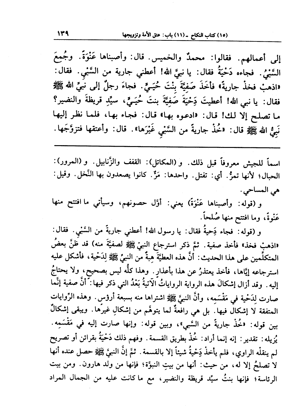 و(قوله: فجاء دِحيَةُ فقال: يا رسول الله! أعطني جارية من السبي. فقال: (اذهب فخذ) فأخذ صفية. ثم ذكر استرجاع النبي صلى الله عليه وسلم لصفية منه. قد ظنَّ بعض المتكلّمين على هذا الحديث: أن هذه العطية هبةٌ من النبي صلى الله عليه وسلم لدحية، فأشكل عليه استرجاعه إيَّاها، فأخذ يعتذر عن هذا بأعذار. وهذا كله ليس بصحيح، ولا يحتاج إليه. وقد أزال إشكال هذه الرواية الروايات الآتية بعد التي ذكر فيها: أن صفية إنّما صارت لدحية في مَقسَمِه، وأن النبي صلى الله عليه وسلم اشتراها منه بسبعة أرؤسٍ. وهذه الروايات المتفقة لا إشكال فيها. بل هي رافعة لما يتوهَّم من إشكال غيرها. ويبقى إشكال بين قوله: (خذ جارية من السَّبي) وبين قوله: (وإنها صارت إليه في مَقسَمِه) يزيله تقدير: إنه إنما أراد: (خذ) بطريق القسمة. وفهم ذلك دِحية بقرائن أو تصريح لم ينقله الراوي، فلم يأخذ دِحية شيئًا إلا بالقسمة. ثم إن النبي صلى الله عليه وسلم حصل عنده أنها لا تصلح إلا له، من حيث إنها من بيت النبوَّة؛ فإنها من ولد هارون. ومن بيت الرئاسة؛ فإنها بنت سيد قريظة والنضير، مع ما كانت عليه من الجمال المراد