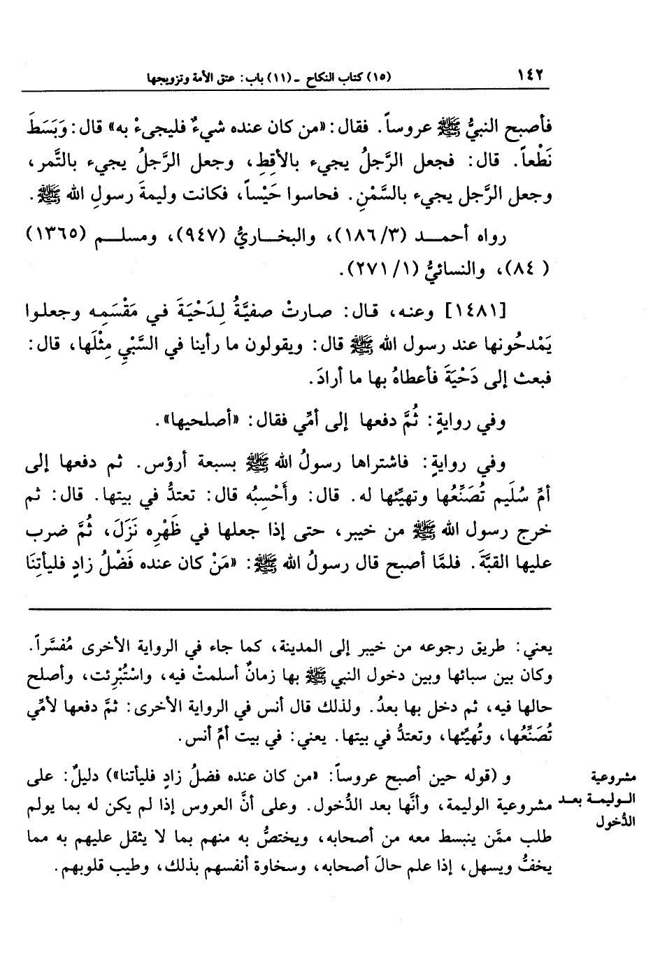 وفي رواية: فَاشتَرَاهَا رَسُولُ اللَّهِ صَلَّى اللَّهُ عَلَيهِ وَسَلَّمَ بِسَبعَةِ أَرؤُسٍ، ثُمَّ دَفَعَهَا إِلَى أُمِّ سُلَيمٍ تُصَنِّعُهَا، وَتُهَيِّئُهَا له، قَالَ: وَأَحسِبُهُ قَالَ: تَعتَدُّ فِي بَيتِهَا، قَالَ: ثُمَّ خَرَجَ رَسُولُ اللَّهِ صَلَّى اللَّهُ عَلَيهِ وَسَلَّمَ مِن خَيبَرَ، حَتَّى إِذَا جَعَلَهَا فِي ظَهرِهِ نَزَلَ، ثُمَّ ضَرَبَ عَلَيهَا القُبَّةَ، فَلَمَّا أَصبَحَ قَالَ رَسُولُ اللَّهِ صَلَّى اللَّهُ عَلَيهِ وَسَلَّمَ: مَن كَانَ عِندَهُ فَضلُ زَادٍ فَليَأتِنَا