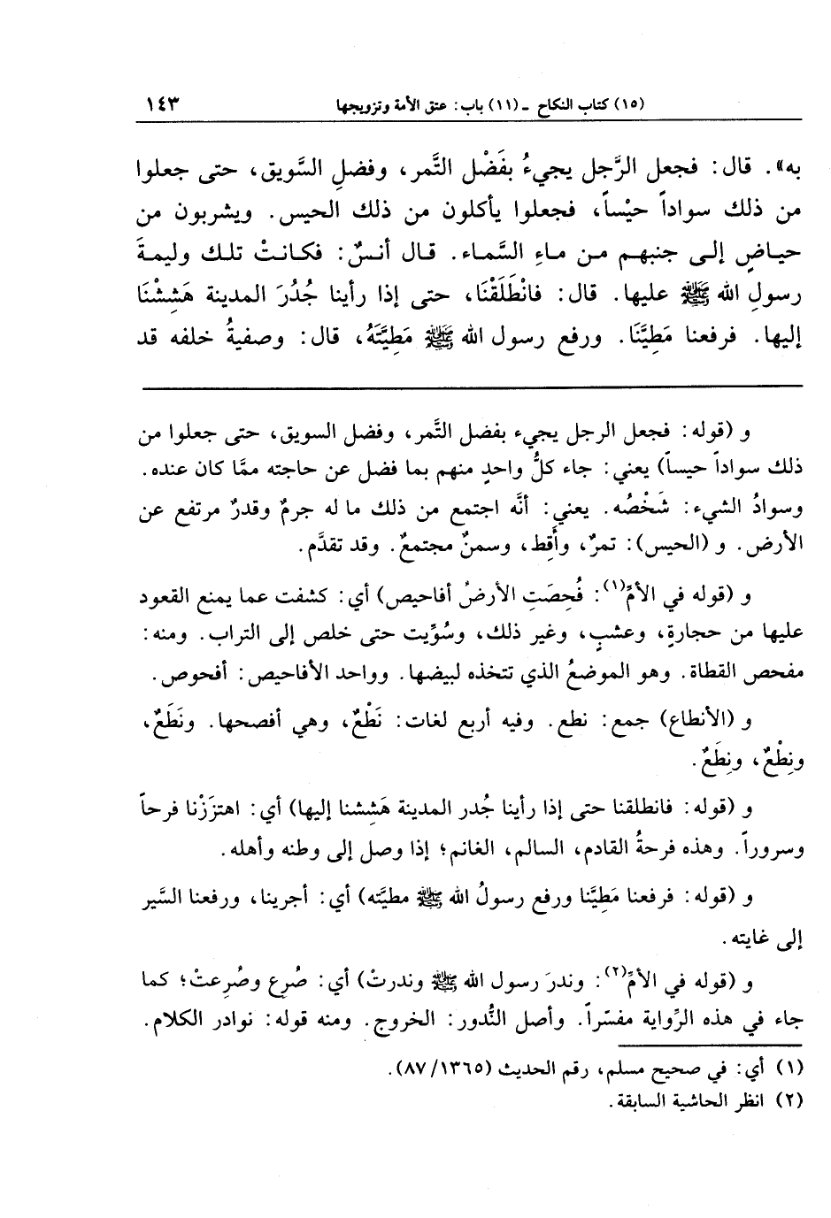بِهِ قَالَ: فَجَعَلَ الرَّجُلُ يَجِيءُ بِفَضلِ التَّمرِ وَفَضلِ السَّوِيقِ، حَتَّى جَعَلُوا مِن ذَلِكَ سَوَادًا حَيسًا، فَجَعَلُوا يَأكُلُونَ مِن ذَلِكَ الحَيسِ، وَيَشرَبُونَ مِن حِيَاضٍ إِلَى جَنبِهِم مِن مَاءِ السَّمَاءِ. قَالَ أنس: فَكَانَت تِلكَ وَلِيمَةَ رَسُولِ اللَّهِ صَلَّى اللَّهُ عَلَيهِ وَسَلَّمَ عَلَيهَا، قَالَ: فَانطلقنَا حَتَّى إِذَا رَأَينَا جُدُرَ المَدِينَةِ هَشِشنَا إِلَيهَا، فَرَفَعنَا مَطِيَّنَا، وَرَفَعَ رَسُولُ اللَّهِ صَلَّى اللَّهُ عَلَيهِ وَسَلَّمَ مَطِيَّتَهُ قَالَ: وَصَفِيَّةُ خَلفَهُ قَد