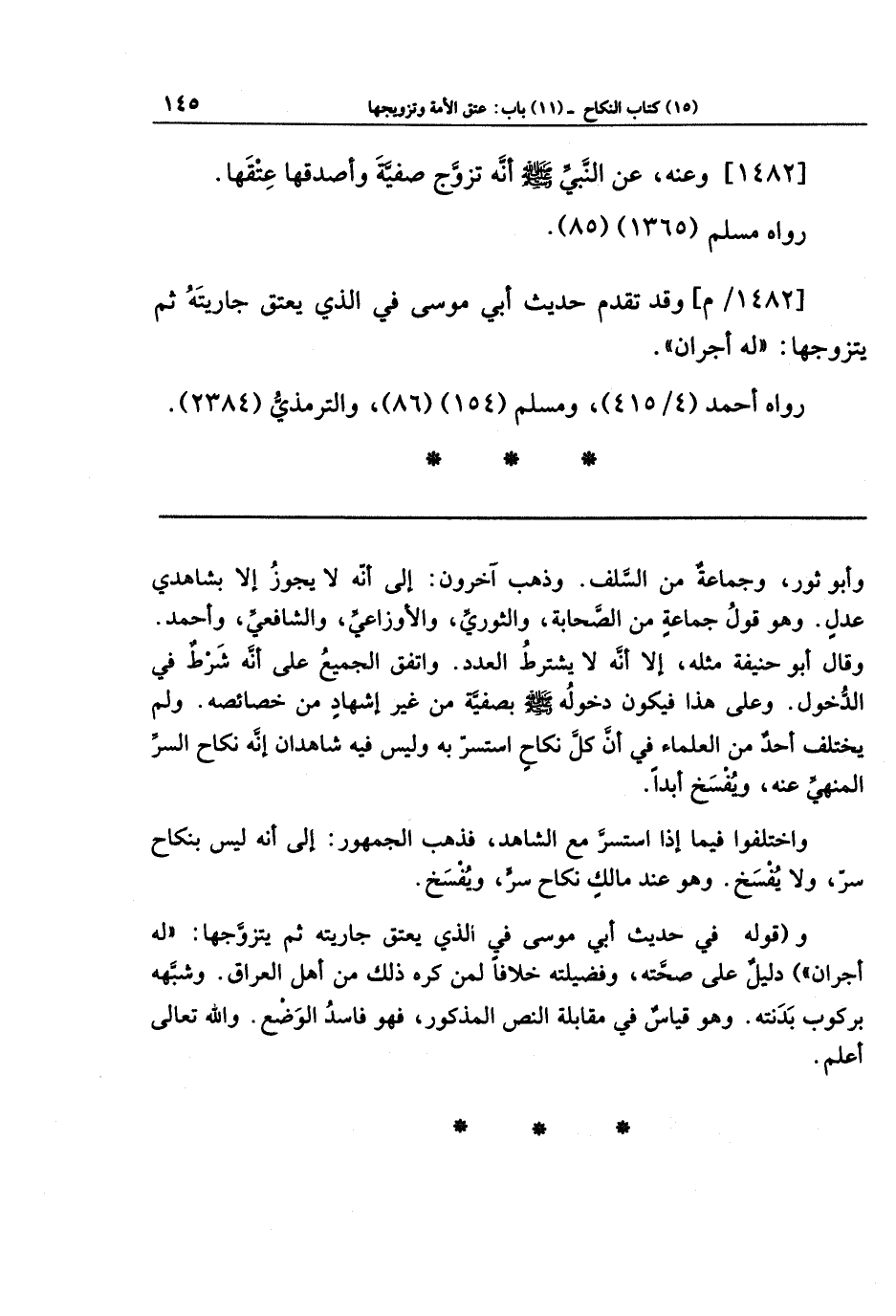 و(قوله في حديث أبي موسى في الذي يعتق جاريته ثم يتزوجها: (له أجران) دليلٌ على صحته، وفضيلته، خلافًا لمن كره ذلك من أهل العراق. وشَبَّهَهُ بركوب بدنته. وهو قياسٌ في مقابلة النصّ المذكور، فهو فاسد الوضع، والله تعالى أعلم.