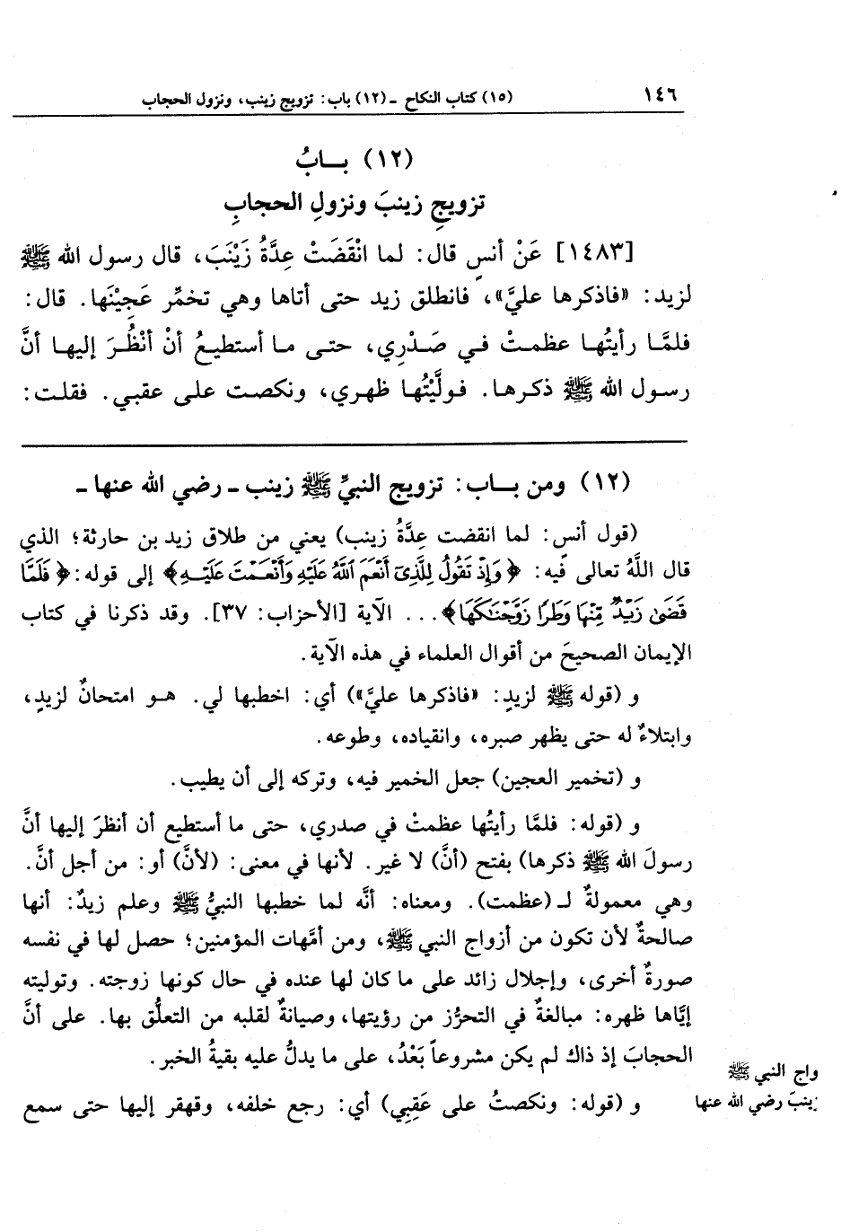 [1483] عَن أَنَسٍ قَالَ: لَمَّا انقَضَت عِدَّةُ زَينَبَ قَالَ رَسُولُ اللَّهِ صَلَّى اللَّهُ عَلَيهِ وَسَلَّمَ لِزَيدٍ: فَاذكُرهَا عَلَيَّ، فَانطلق زَيدٌ حَتَّى أَتَاهَا وَهِيَ تُخَمِّرُ عَجِينَهَا قَالَ: فَلَمَّا رَأَيتُهَا عَظُمَت فِي صَدرِي حَتَّى مَا أَستَطِيعُ أَن أَنظُرَ إِلَيهَا أَنَّ رَسُولَ اللَّهِ صَلَّى اللَّهُ عَلَيهِ وَسَلَّمَ ذَكَرَهَا، فَوَلَّيتُهَا ظَهرِي، وَنَكَصتُ عَلَى عَقِبِي فَقُلتُ: