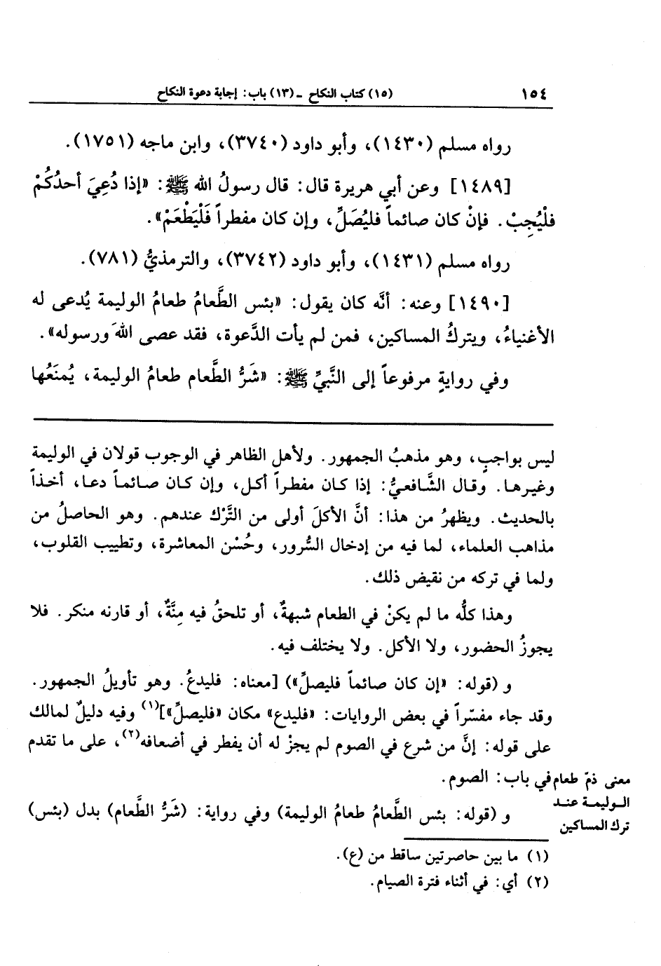 [1489] وعَن أَبِي هُرَيرَةَ قَالَ: قَالَ رَسُولُ اللَّهِ صَلَّى اللَّهُ عَلَيهِ وَسَلَّمَ: إِذَا دُعِيَ أَحَدُكُم فَليُجِب، فَإِن كَانَ صَائِمًا فَليُصَلِّ، وَإِن كَانَ مُفطِرًا فَليَطعَم.