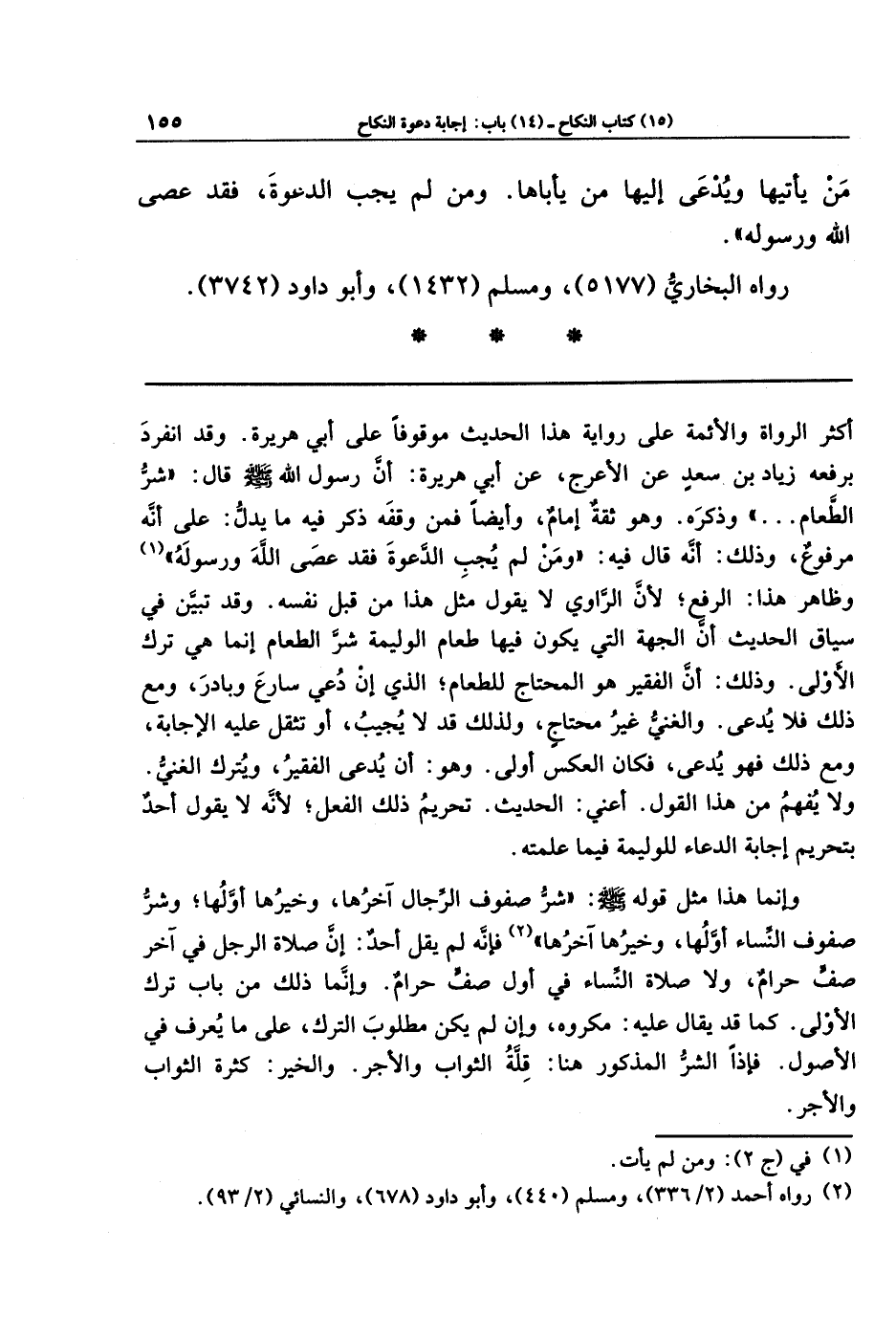 أكثرُ الرواة والأئمة على رواية هذا الحديث موقوفًا على أبي هريرة. وقد انفرد برفعه زياد بن سعد عن الأعرج، عن أبي هريرة: أن رسول الله صلى الله عليه وسلم قال: (شرُّ الطَّعام. . .) وذكره. وهو ثقة إمام، وأيضًا فمن وقفه ذكر فيه ما يدلُّ: على أنه مرفوع؛ وذلك أنه قال فيه: (ومن لم يجب الدَّعوة فقد عصى الله ورسوله) (¬1) وظاهر هذا: الرفعُ؛ لأنَّ الرَّاوي لا يقول مثل هذا من قِبَل نفسه. وقد تبيّن في سياق الحديث أنَّ الجهة التي يكون فيها طعام الوليمة شرُّ الطعام: إنما هي ترك الأَولى. وذلك: أن الفقير هو المحتاج للطعام؛ الذي إن دُعي سارعَ وبادرَ، ومع ذلك فلا يُدعَى. والغنيُّ غير محتاج، ولذلك قد لا يجيب، أو تثقل عليه الإجابة، ومع ذلك فهو يدعى، فكان العكس أولى. وهو: أن يُدعى الفقير، ويُترك الغني. ولا يُفهم من هذا القول - أعني: الحديث -: تحريم ذلك الفعل؛ لأنه لا يقول أحد بتحريم إجابة الدعاء للوليمة فيما علمته؛ وإنما هذا مثل قوله صلى الله عليه وسلم: (شرُّ صفوف الرِّجال آخرها، وخيرها أولها، وشرُّ صفوف النساء أولها، وخيرها آخرها) (¬2) فإنَّه لم يقل أحد: إن صلاة الرجل في آخر صف حرام، ولا صلاة النساء في أول صف حرام. وإنَّما ذلك من باب ترك الأولى. كما قد يقال عليه: مكروه، وإن لم يكن مطلوب الترك، على ما يُعرَف في الأصول. فإذًا الشرُّ المذكور هنا: قلةُ الثواب والأجر. والخير: كثرة الثواب والأجر.