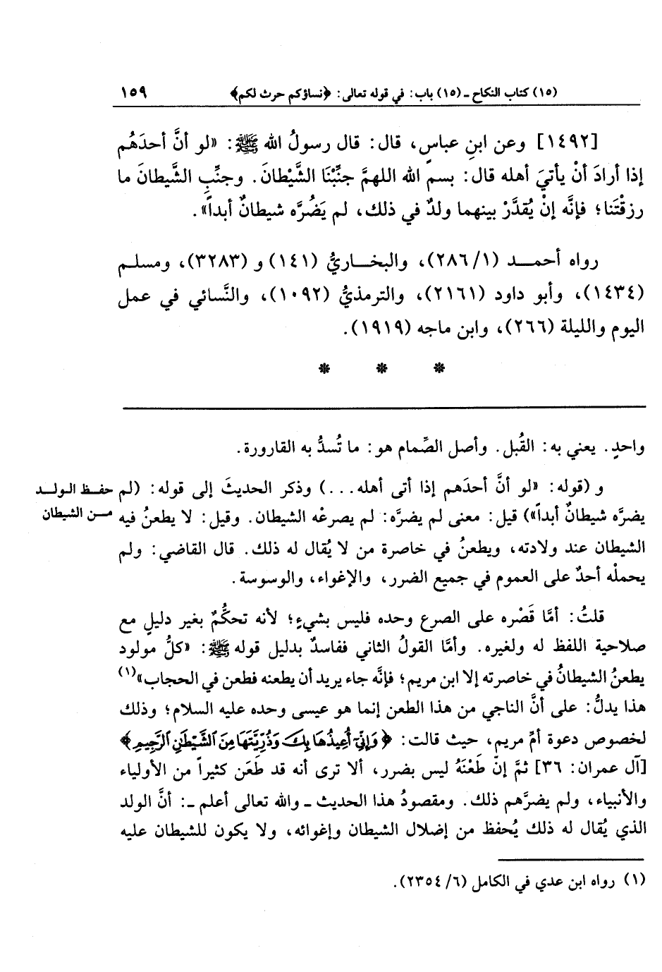 [1492] وعَن ابنِ عَبَّاسٍ قَالَ: قَالَ رَسُولُ اللَّهِ صَلَّى اللَّهُ عَلَيهِ وَسَلَّمَ: لَو أَنَّ أَحَدَهُم إِذَا أَرَادَ أَن يَأتِيَ أَهلَهُ قَالَ: بِسمِ اللَّهِ اللَّهُمَّ جَنِّبنَا الشَّيطَانَ، وَجَنِّب الشَّيطَانَ مَا رَزَقتَنَا، فَإِنَّهُ إِن يُقَدَّر بَينَهُمَا وَلَدٌ فِي ذَلِكَ لَم يَضُرَّهُ شَيطَانٌ أَبَدًا.