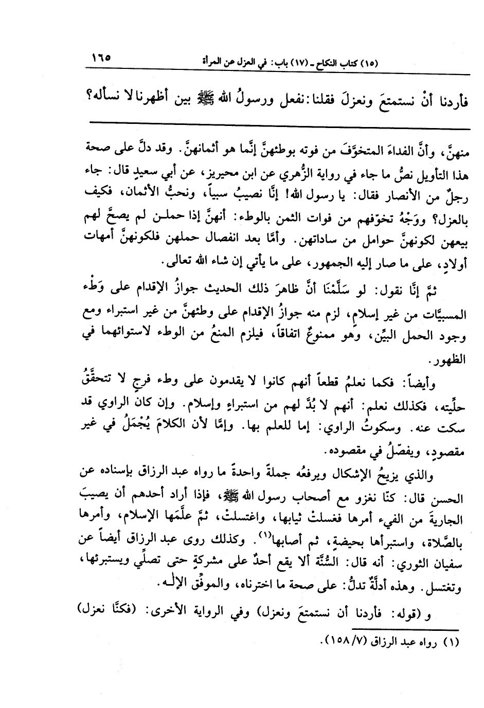 فَأَرَدنَا أَن نَستَمتِعَ، وَنَعزِلَ فَقُلنَا: نَفعَلُ وَرَسُولُ اللَّهِ صَلَّى اللَّهُ عَلَيهِ وَسَلَّمَ بَينَ أَظهُرِنَا لَا نَسأَلُهُ؟