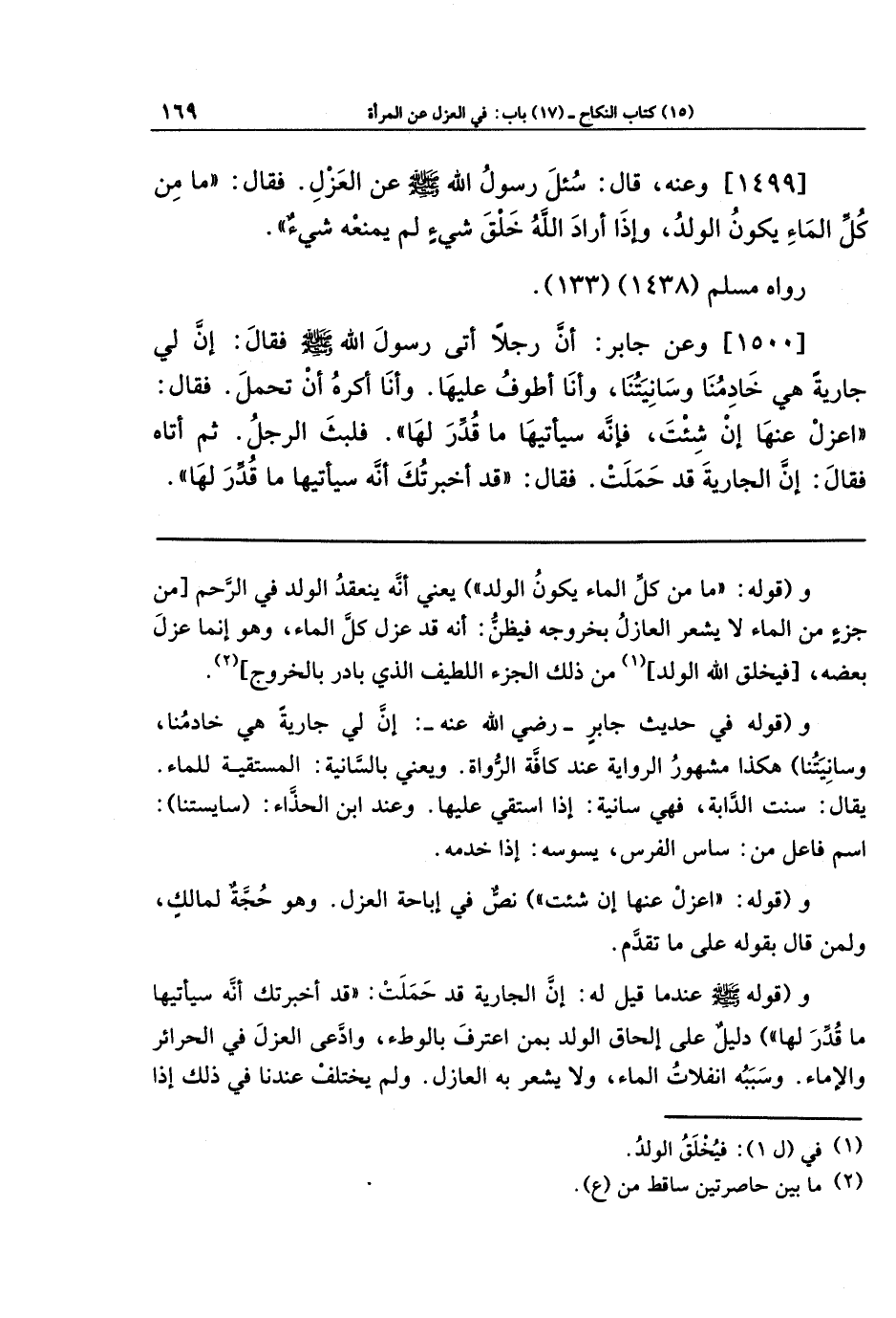 [1499] وعنه قُالُ: سُئِلَ رَسُولُ اللَّهِ صَلَّى اللَّهُ عَلَيهِ وَسَلَّمَ عَن العَزلِ فَقَالَ: مَا مِن كُلِّ المَاءِ يَكُونُ الوَلَدُ، وَإِذَا أَرَادَ اللَّهُ خَلقَ شَيءٍ لَم يَمنَعهُ شَيءٌ.