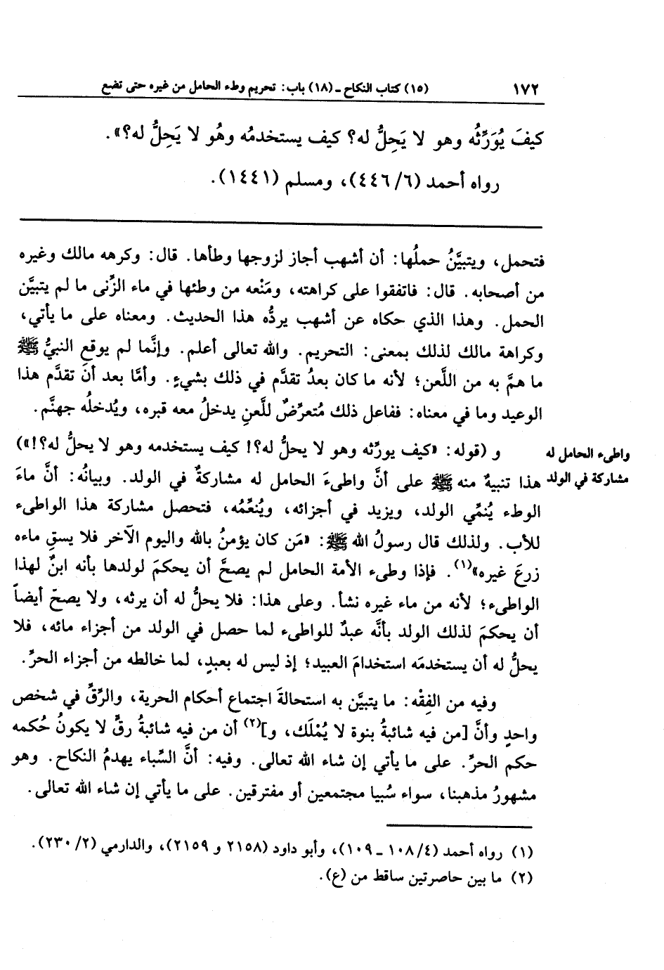 و(قوله: كيف يورثه وهو لا يحل له؟ ! كيف يستخدمه وهو لا يحل له؟ ! ) هذا تنبيه منه صلى الله عليه وسلم على أن واطئ الحامل له مشاركة في الولد. وبيانه: أن ماء الوطء يُنَمِّي الولد، ويزيد في أجزائه، ويُنعِّمه، فتحصل مشاركة هذا الواطئ للأب؛ ولذلك قال رسول الله صلى الله عليه وسلم: (من كان يؤمن بالله واليوم الآخر فلا يسق ماءه زرع غيره) (¬1). فإذا وطئ الأمة الحامل لم يصحّ أن يحكم لولدها بأنه ابن لهذا الواطئ؛ لأنه من ماء غيره نشأ. وعلى هذا فلا يحلُّ له أن يرثه، ولا يصح أيضًا أن يحكم لذلك الولد بأنه عبدٌ للواطئ؛ لما حصل في الولد من أجزاء مائه، فلا يحلَّ له أن يستخدمه استخدام العبيد؛ إذ ليس له بعبدٍ، لِمَا خالطه من أجزاء الحُرِّ.
