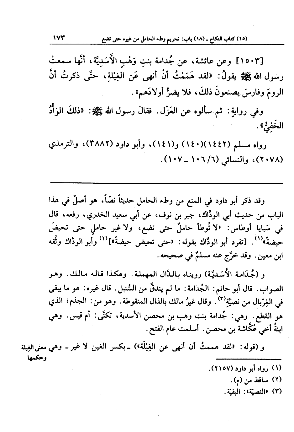 [1503] وعَن عَائِشَةَ عَن جُدَامَةَ بِنتِ وَهبٍ الأَسَدِيَّةِ أَنَّهَا سَمِعَت رَسُولَ اللَّهِ صَلَّى اللَّهُ عَلَيهِ وَسَلَّمَ يَقُولُ: لَقَد هَمَمتُ أَن أَنهَى عَن الغِيلَةِ، حَتَّى ذَكَرتُ أَن الروم وَفَارِسَ يَصنَعُونَ ذَلِكَ، فَلَا يَضُرُّ أَولَادَهُم.