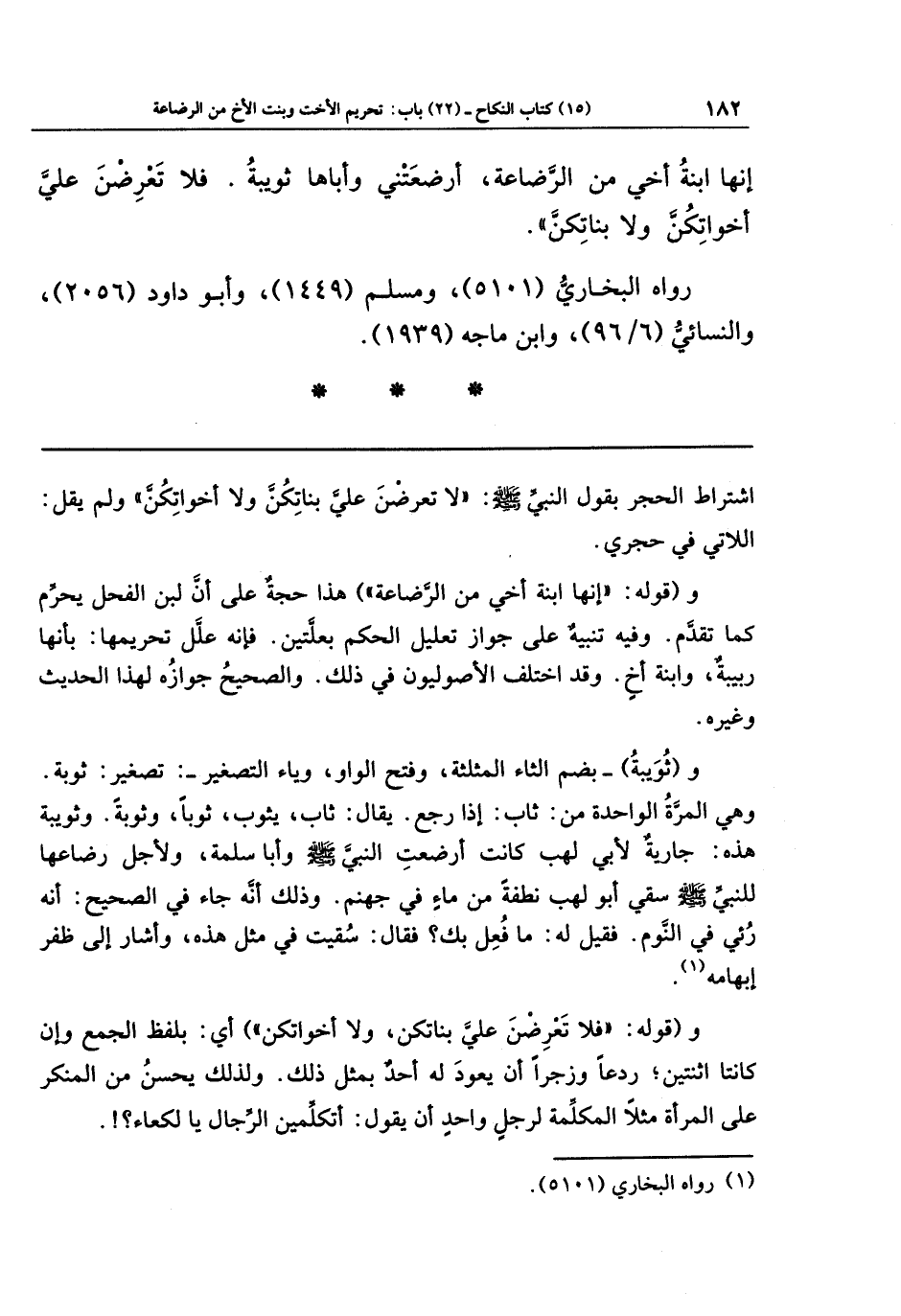 إِنَّهَا ابنَةُ أَخِي مِن الرَّضَاعَةِ أَرضَعَتنِي وَأَبَاهَا ثُوَيبَةُ فَلَا تَعرِضنَ عَلَيَّ أَخَوَاتِكُنَّ، وَلَا بَنَاتِكُنَّ.