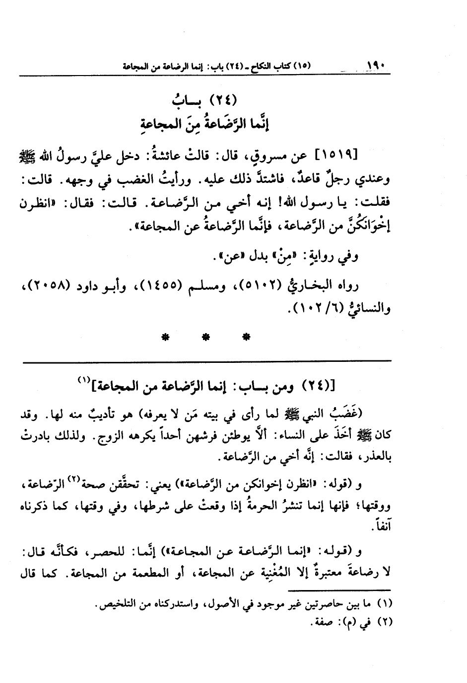 [1519] عَن مَسرُوقٍ قَالَ: قَالَت عَائِشَةُ: دَخَلَ عَلَيَّ رَسُولُ اللَّهِ صَلَّى اللَّهُ عَلَيهِ وَسَلَّمَ، وَعِندِي رَجُلٌ قَاعِدٌ فَاشتَدَّ ذَلِكَ عَلَيهِ، وَرَأَيتُ الغَضَبَ فِي وَجهِهِ قَالَت: فَقُلتُ: يَا رَسُولَ اللَّهِ إِنَّهُ أَخِي مِن الرَّضَاعَةِ، قَالَت: فَقَالَ: انظُرنَ إِخوَانَكُنَّ مِن الرَّضَاعَةِ، فَإِنَّمَا الرَّضَاعَةُ عن المَجَاعَةِ.