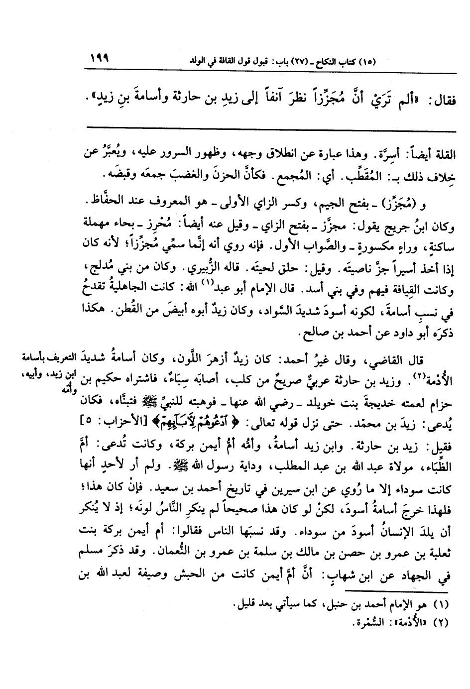 قال الإمام أبو عبد (¬1) الله: كانت الجاهلية تقدح في نسب أسامة، لكونه أسود شديد السَّواد، وكان زيدٌ أبوه أبيض من القطن. هكذا ذكره أبو داود عن أحمد بن صالح.