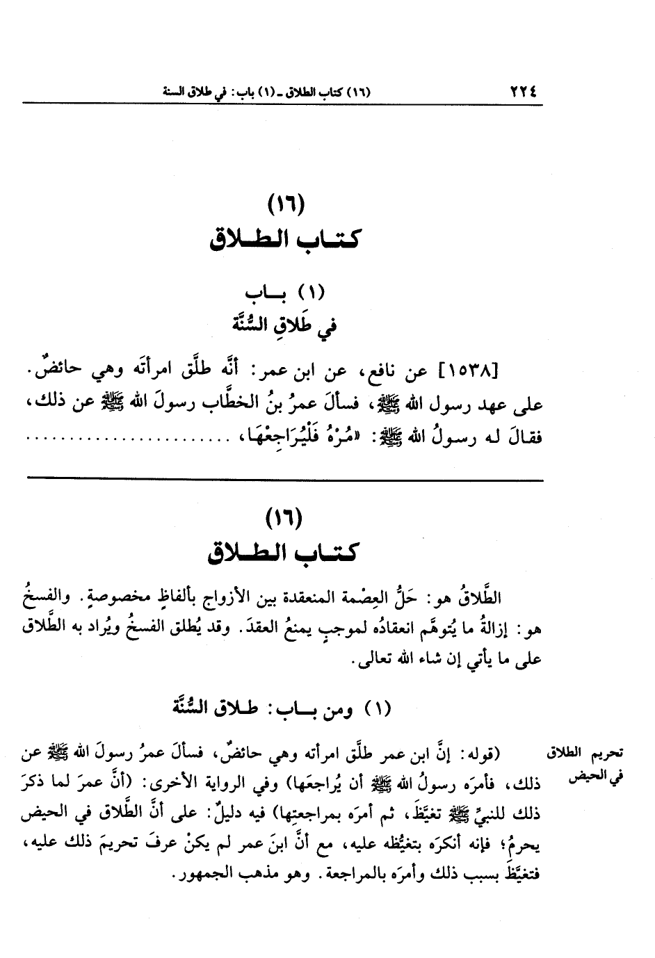 [1538] عَن نَافِعٍ، عَن ابنِ عُمَرَ: أَنَّهُ طلق امرَأَتَهُ وَهِيَ حَائِضٌ على عَهدِ رَسُولِ اللَّهِ صَلَّى اللَّهُ عَلَيهِ وَسَلَّمَ، فَسَأَلَ عُمَرُ بنُ الخَطَّابِ رَسُولَ اللَّهِ صَلَّى اللَّهُ عَلَيهِ وَسَلَّمَ عَن ذَلِكَ، فَقَالَ لَهُ رَسُولُ اللَّهِ صَلَّى اللَّهُ عَلَيهِ وَسَلَّمَ: مُرهُ فَليُرَاجِعهَا،