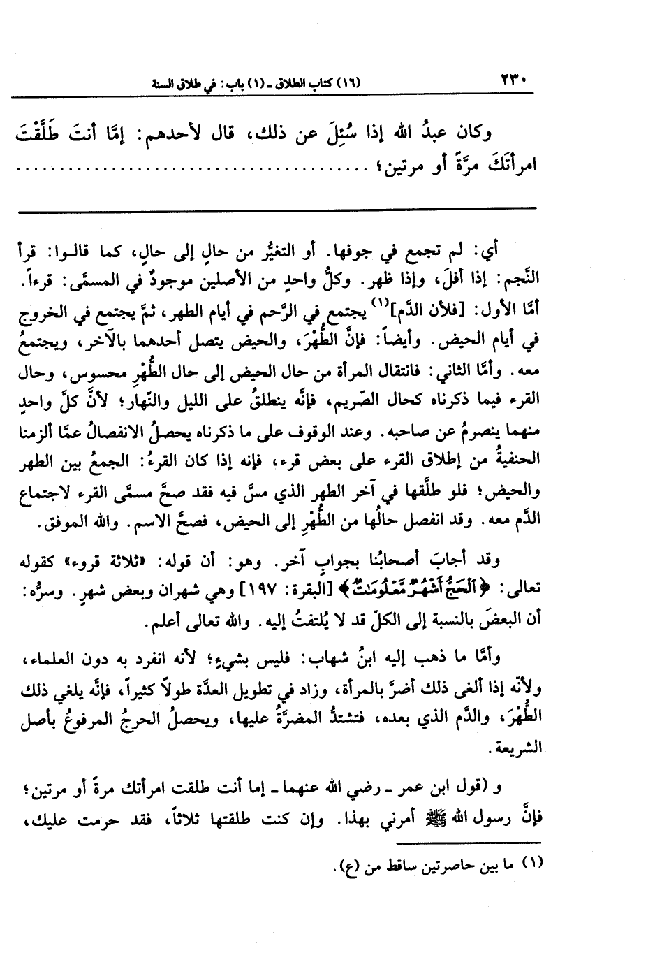 وقول ابن عمر رضي الله عنهما: (إمَّا أنت طلقت امرأتك مرة أو مرتين؛ فإن رسول الله صلى الله عليه وسلم أمرني بهذا. وإن كنت طلقتها ثلاثًا، فقد حرمت عليك،