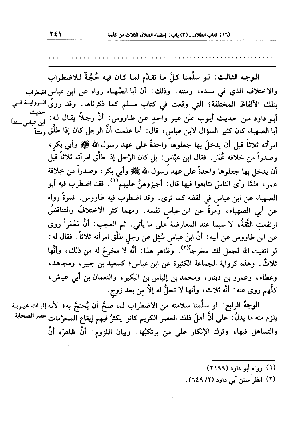 الوجه الثالث: لو سلمنا كل ما تقدَّم؛ لَمَا كان فيه حجة؛ للاضطراب والاختلاف الذي في سنده ومتنه؛ وذلك: أن أبا الصهباء رواه عن ابن عباس بتلك الألفاظ المختلفة؛ التي وقعت في كتاب مسلم كما ذكرناها. وقد روى أبو داود من حديث أيوب، عن غير واحد، عن طاوس: أن رجلًا يقال له: أبا الصهباء كان كثير السؤال لابن عباس. قال: أما علمت أن الرجل كان إذا طلق امرأته ثلاثًا قبل أن يدخل بها جعلوها واحدةً على عهد رسول الله صلى الله عليه وسلم وأبي بكر، وصدرًا من خلافة عمر. فقال ابن عباس: بل كان الرجل إذا طلق امرأته ثلاثًا قبل أن يدخل بها جعلوها واحدة على عهد رسول الله صلى الله عليه وسلم وأبي بكر، وصدرًا من خلافة عمر، فلمَّا رأى الناس تتايعوا فيها قال: أجيزوهُنَّ عليهم (¬1). فقد اضطرب فيه أبو الصهباء عن ابن عباس في لفظه كما ترى. وقد اضطرب فيه طاوس. فمرَّة رواه عن أبي الصهباء، ومرَّة عن ابن عباس نفسه. ومهما كثر الاختلاف والتناقض ارتفعت الثقة، لا سيما عند المعارضة على ما يأتي.