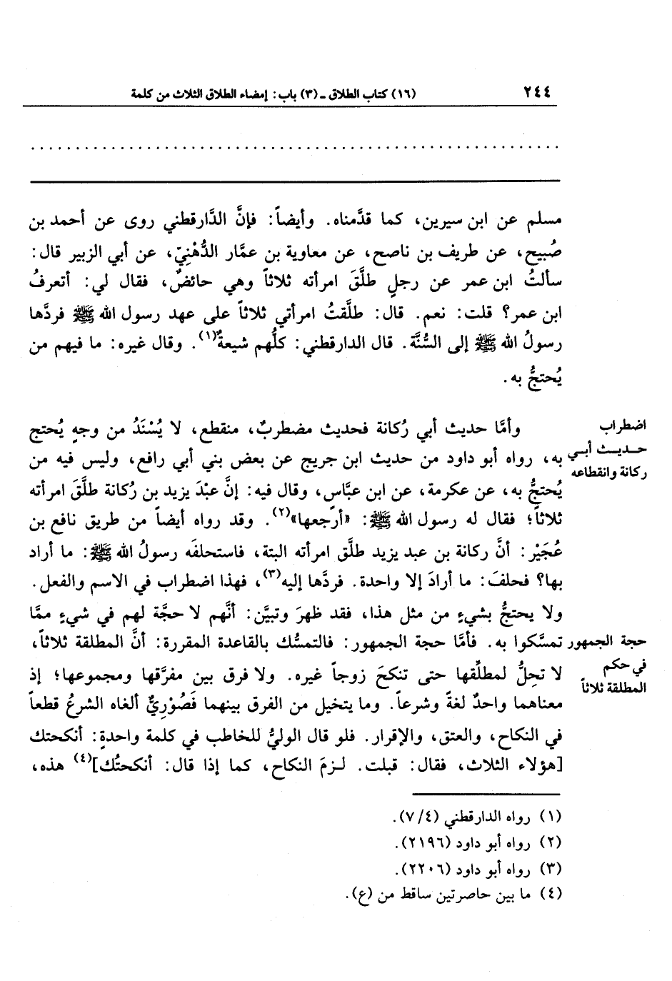 وأمَّا حديث أبي رُكَانة فحديث مضطرب، منقطع، لا يُسنَد من وجه يحتج به؛ رواه أبو داود من حديث ابن جريج عن بعض بني أبي رافع، وليس فيه من يحتج به، عن عكرمة، عن ابن عباس، وقال فيه: إن عبد يزيد بن ركانة طلق امرأته ثلاثًا، فقال له رسول الله صلى الله عليه وسلم: (أرجعها) (¬2). وقد رواه أيضًا من طريق نافع بن عُجَير: أن ركانة بن عبد يزيد طلق امرأته البتة، فاستحلفه رسول الله صلى الله عليه وسلم: ما أراد بها؟ فحلف: ما أراد إلا واحدة. فردَّها إليه (¬3).