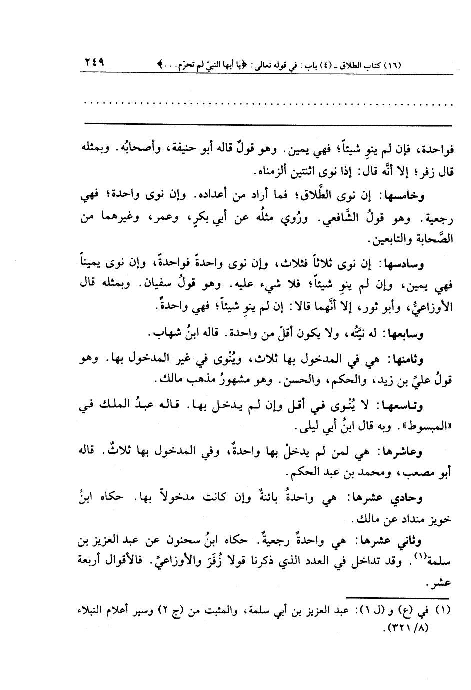 وعاشرها: هي لمن لم يدخل بها واحدة، وفي المدخول بها: ثلاث. قاله أبو مصعب، ومحمد بن عبد الحكم.
