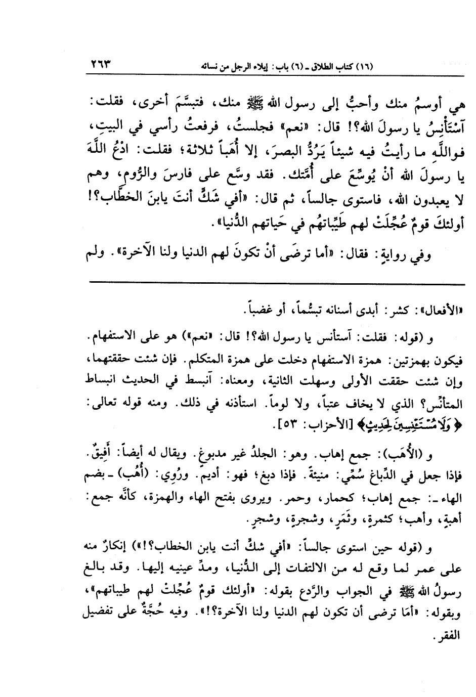 هِيَ أَوسَمُ مِنكِ، وَأَحَبُّ إِلَى رَسُولِ اللَّهِ صَلَّى اللَّهُ عَلَيهِ وَسَلَّمَ مِنكِ، فَتَبَسَّمَ أُخرَى، فَقُلتُ: آَستَأنِسُ يَا رَسُولَ اللَّهِ؟ قَالَ: نَعَم، فَجَلَستُ، فَرَفَعتُ رَأسِي فِي البَيتِ فَوَاللَّهِ مَا رَأَيتُ فِيهِ شَيئًا يَرُدُّ البَصَرَ إِلَّا أُهَبًا ثَلَاثَةً. فَقُلتُ: ادعُ اللَّهَ يَا رَسُولَ اللَّهِ أَن يُوَسِّعَ عَلَى أُمَّتِكَ، فَقَد وَسَّعَ عَلَى فَارِسَ وَالرُّومِ وَهُم لَا يَعبُدُونَ اللَّهَ، فَاستَوَى جَالِسًا، ثُمَّ قَالَ: أَفِي شَكٍّ أَنتَ يَا بنَ الخَطَّابِ؟ أُولَئِكَ قَومٌ عُجِّلَت لَهُم طَيِّبَاتُهُم فِي حَيَاتهم الدُّنيَا.