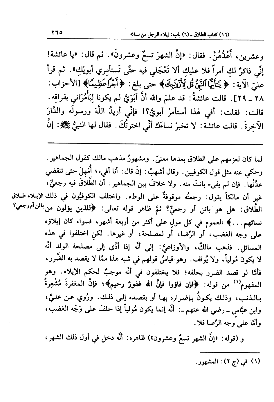 وَعِشرِينَ أَعُدُّهُنَّ فَقَالَ: إِنَّ الشَّهرَ تِسعٌ وَعِشرُونَ، ثُمَّ قَالَ: يَا عَائِشَةُ إِنِّي ذَاكِرٌ لَكِ أَمرًا، فَلَا عَلَيكِ أَلَا تَعجَلِي فِيهِ حَتَّى تَستَأمِرِي أَبَوَيكِ. ثُمَّ قَرَأَ عَلَيَّ الآيَةَ: يَا أَيُّهَا النَّبِيُّ قُل لِأَزوَاجِكَ حَتَّى بَلَغَ أَجرًا عَظِيمًا قَالَت عَائِشَةُ: قَد عَلِمَ وَاللَّهِ أَنَّ أَبَوَيَّ لَم يَكُونَا لِيَأمُرَانِي بِفِرَاقِهِ. قَالَت: فَقُلتُ: أَفِي هَذَا أَستَأمِرُ أَبَوَيَّ؟ فَإِنِّي أُرِيدُ اللَّهَ وَرَسُولَهُ وَالدَّارَ الآخِرَةَ. قَالَت عَائِشَةَ: لَا تُخبِر نِسَاءَكَ أَنِّي اختَرتُكَ، فَقَالَ لَهَا النَّبِيُّ صَلَّى اللَّهُ عَلَيهِ وَسَلَّمَ: إِنَّ