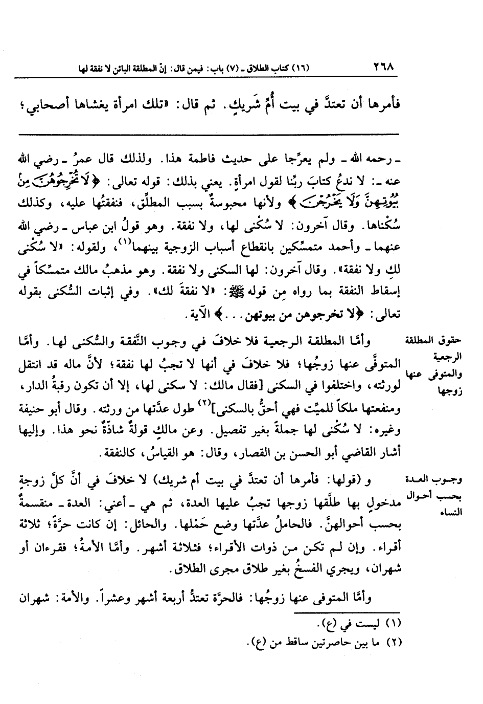 - رحمه الله - ولم يُعَرّجا على حديث فاطمة هذا. ولذلك قال عمر رضي الله عنه: (لا ندع كتاب ربنا لقول امرأة) يعني بذلك: قوله تعالى: {لا تُخرِجُوهُنَّ مِن بُيُوتِهِنَّ وَلا يَخرُجنَ}؛ ولأنها محبوسة بسبب المطلق، فنفقتها عليه، وكذلك سُكناها. وقال آخرون: لا سُكنى لها، ولا نفقة. وهو قول ابن عباس رضي الله عنهما وأحمد متمسِّكين بانقطاع أسباب الزوجية بينهما (¬1)، ولقوله: (لا سكنى لك ولا نفقة).