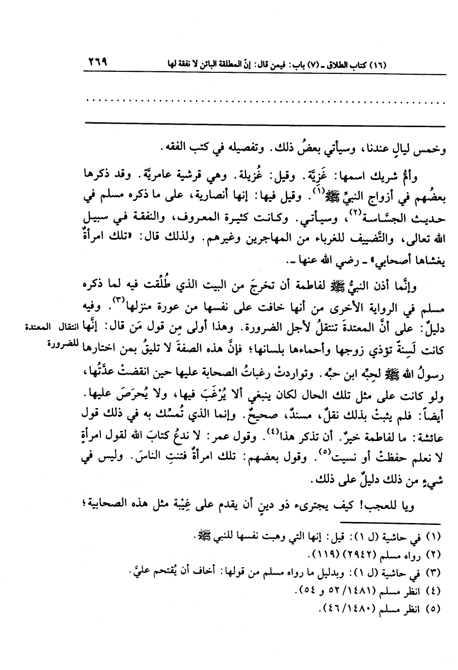 وفيه دليل: على أن المعتدة تنتقل لأجل الضرر. وهذا أولى من قول من قال: إنها كانت لَسِنَةً تُؤذي زوجَها وأحماءهَا بلسانها؛ فإن هذه الصِّفَة لا تليق بمن اختارها رسول الله صلى الله عليه وسلم لِحبِّه ابن حِبِّه. وتواردت رغبات الصحابة عليها حين انقضت عدَّتُها، ولو كانت على مثل تلك الحال لكان ينبغي ألا يُرغَبَ فيها، ولا يُحرَصَ عليها. أيضًا: فلم يثبت بذلك نقل مُسنَدٌ صحيحٌ. وإنما الذي تمسَّك به في ذلك قول عائشة: ما لفاطمة خير أن تذكر هذا (¬4).