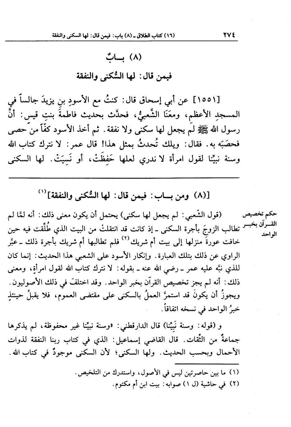 [1551] عَن أَبِي إِسحَاقَ قَالَ: كُنتُ مَعَ الأَسوَدِ بنِ يَزِيدَ جَالِسًا فِي المَسجِدِ الأَعظَمِ وَمَعَنَا الشَّعبِيُّ، فَحَدَّثَ بِحَدِيثِ فَاطِمَةَ بِنتِ قَيسٍ أَنَّ رَسُولَ اللَّهِ صَلَّى اللَّهُ عَلَيهِ وَسَلَّمَ لَم يَجعَل لَهَا سُكنَى وَلَا نَفَقَةً. ثُمَّ أَخَذَ الأَسوَدُ كَفًّا مِن حَصًى فَحَصَبَهُ بِهِ فَقَالَ: وَيلَكَ تُحَدِّثُ بِمِثلِ هَذَا، قَالَ عُمَرُ: لَا نَترُكُ كِتَابَ اللَّهِ وَسُنَّةَ نَبِيِّنَا لِقَولِ امرَأَةٍ لَا نَدرِي لَعَلَّهَا حَفِظَت أَو نَسِيَت. لَهَا السُّكنَى