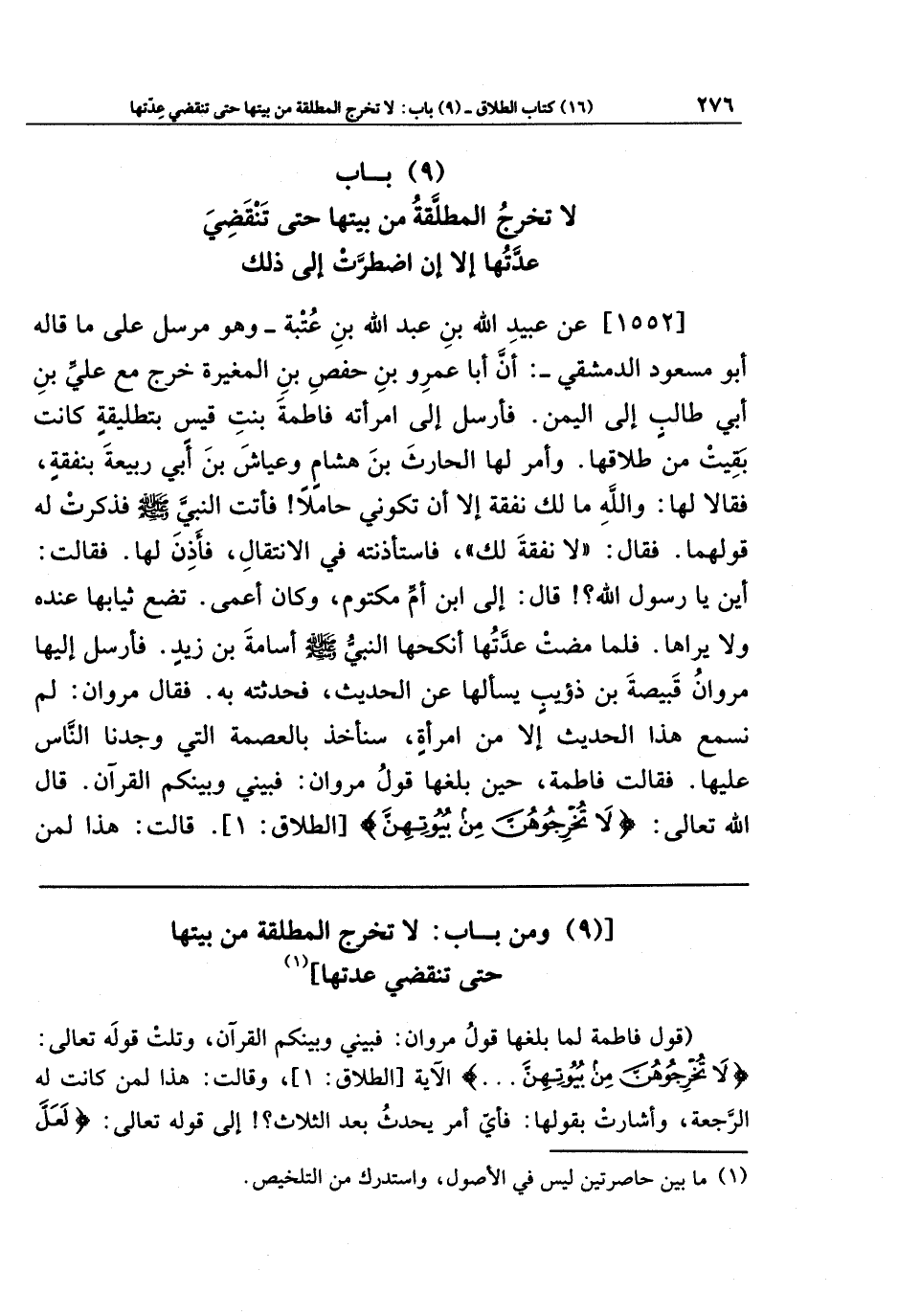 [1552] عَن عُبَيدِ اللَّهِ بنِ عَبدِ اللَّهِ بنِ عُتبَةَ - وهو مرسل على ما قاله أبو مسعود الدمشقي - أَنَّ أَبَا عَمرِو بنَ حَفصِ بنِ المُغِيرَةِ خَرَجَ مَعَ عَلِيِّ بنِ أَبِي طَالِبٍ إِلَى اليَمَنِ فَأَرسَلَ إِلَى امرَأَتِهِ فَاطِمَةَ بِنتِ قَيسٍ بِتَطلِيقَةٍ كَانَت بَقِيَت مِن طَلَاقِهَا، وَأَمَرَ لَهَا الحَارِثَ بنَ هِشَامٍ، وَعَيَّاشَ بنَ أَبِي رَبِيعَةَ بِنَفَقَةٍ فَقَالَا لَهَا: وَاللَّهِ مَا لَكِ نَفَقَةٌ إِلَّا أَن تَكُونِي حَامِلًا، فَأَتَت النَّبِيَّ صَلَّى اللَّهُ عَلَيهِ وَسَلَّمَ فَذَكَرَت لَهُ قَولَهُمَا فَقَالَ: لَا نَفَقَةَ لَكِ. فَاستَأذَنَتهُ فِي الِانتِقَالِ، فَأَذِنَ لَهَا فَقَالَت: أَينَ يَا رَسُولَ اللَّهِ؟ فَقَالَ: إِلَى ابنِ أُمِّ مَكتُومٍ وَكَانَ أَعمَى تَضَعُ ثِيَابَهَا عِندَهُ وَلَا يَرَاهَا، فَلَمَّا مَضَت عِدَّتُهَا أَنكَحَهَا النَّبِيُّ صَلَّى اللَّهُ عَلَيهِ وَسَلَّمَ أُسَامَةَ بنَ زَيدٍ، فَأَرسَلَ إِلَيهَا مَروَانُ قَبِيصَةَ بنَ ذُؤَيبٍ يَسأَلُهَا عَن الحَدِيثِ، فَحَدَّثَتهُ بِهِ فَقَالَ مَروَانُ: لَم نَسمَع هَذَا الحَدِيثَ إِلَّا مِن امرَأَةٍ سَنَأخُذُ بِالعِصمَةِ الَّتِي وَجَدنَا النَّاسَ عَلَيهَا. فَقَالَت فَاطِمَةُ حِينَ بَلَغَهَا قَولُ مَروَانَ: فَبَينِي وَبَينَكُم القُرآنُ قَالَ اللَّهُ تعالى: لَا تُخرِجُوهُنَّ مِن بُيُوتِهِنَّ، قَالَت: هَذَا لِمَن