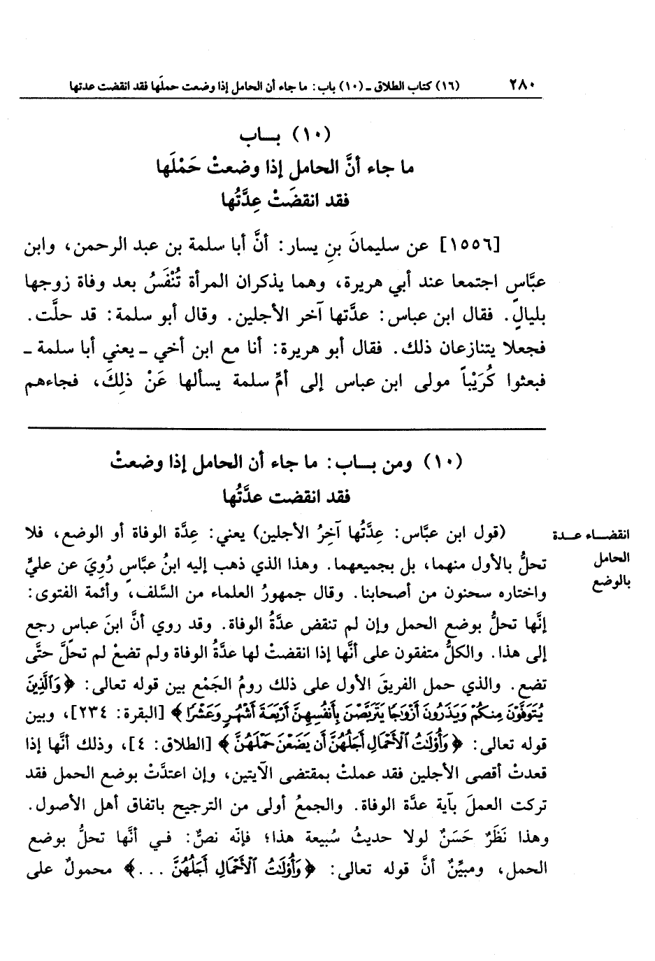 [1556] عن سُلَيمَانُ بنُ يَسَارٍ، أَنَّ أَبَا سَلَمَةَ بنَ عَبدِ الرَّحمَنِ، وَابنَ عَبَّاسٍ اجتَمَعَا عِندَ أَبِي هُرَيرَةَ وَهُمَا يَذكُرَانِ المَرأَةَ تُنفَسُ بَعدَ وَفَاةِ زَوجِهَا بِلَيَالٍ فَقَالَ ابنُ عَبَّاسٍ: عِدَّتُهَا آخِرُ الأَجَلَينِ، وَقَالَ أَبُو سَلَمَةَ: قَد حَلَّت فَجَعَلَا يَتَنَازَعَانِ ذَلِكَ. فَقَالَ أَبُو هُرَيرَةَ: أَنَا مَعَ ابنِ أَخِي يَعنِي: أَبَا سَلَمَةَ فَبَعَثُوا كُرَيبًا مَولَى ابنِ عَبَّاسٍ إِلَى أُمِّ سَلَمَةَ يَسأَلُهَا عَن ذَلِكَ؟ فَجَاءَهُم،