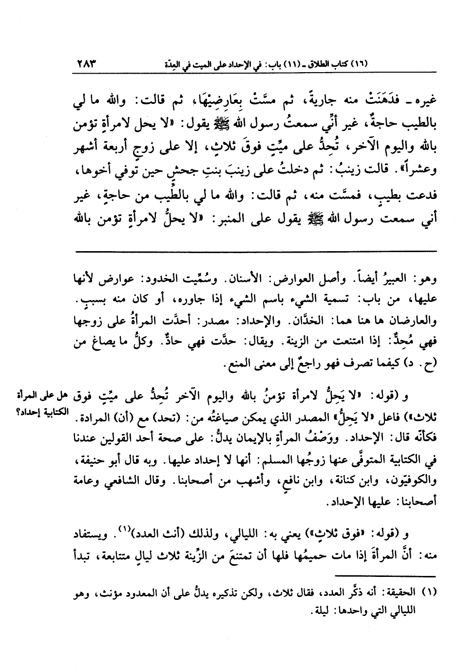 و(قوله: لا يحل لامرأة تؤمن بالله واليوم الآخر تحدَّ على ميت فوق ثلاث) فاعل (لا يحل) المصدر الذي يمكن صياغته من (تحد) مع (أن) المرادة. فكأنَّه قال: الإحداد.