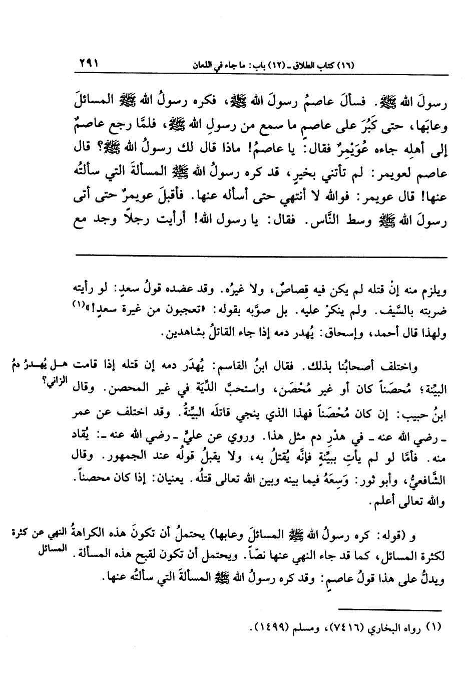 رَسُولَ اللَّهِ صَلَّى اللَّهُ عَلَيهِ وَسَلَّمَ، فَسَأَلَ عَاصِمٌ رَسُولَ اللَّهِ صَلَّى اللَّهُ عَلَيهِ وَسَلَّمَ، فَكَرِهَ رَسُولُ اللَّهِ صَلَّى اللَّهُ عَلَيهِ وَسَلَّمَ المَسَائِلَ، وَعَابَهَا حَتَّى كَبُرَ عَلَى عَاصِمٍ مَا سَمِعَ مِن رَسُولِ اللَّهِ صَلَّى اللَّهُ عَلَيهِ وَسَلَّمَ. فَلَمَّا رَجَعَ عَاصِمٌ إِلَى أَهلِهِ جَاءَهُ عُوَيمِرٌ فَقَالَ: يَا عَاصِمُ مَاذَا قَالَ لَكَ رَسُولُ اللَّهِ صَلَّى اللَّهُ عَلَيهِ وَسَلَّمَ؟ قَالَ عَاصِمٌ لِعُوَيمِرٍ: لَم تَأتِنِي بِخَيرٍ قَد كَرِهَ رَسُولُ اللَّهِ صَلَّى اللَّهُ عَلَيهِ وَسَلَّمَ المَسأَلَةَ الَّتِي سَأَلتُهُ عَنهَا، قَالَ عُوَيمِرٌ: فوَاللَّهِ لَا أَنتَهِي حَتَّى أَسأَلَهُ عَنهَا، فَأَقبَلَ عُوَيمِرٌ حَتَّى أَتَى رَسُولَ اللَّهِ صَلَّى اللَّهُ عَلَيهِ وَسَلَّمَ وَسَطَ النَّاسِ، فَقَالَ: يَا رَسُولَ اللَّهِ أَرَأَيتَ رَجُلًا وَجَدَ مَعَ