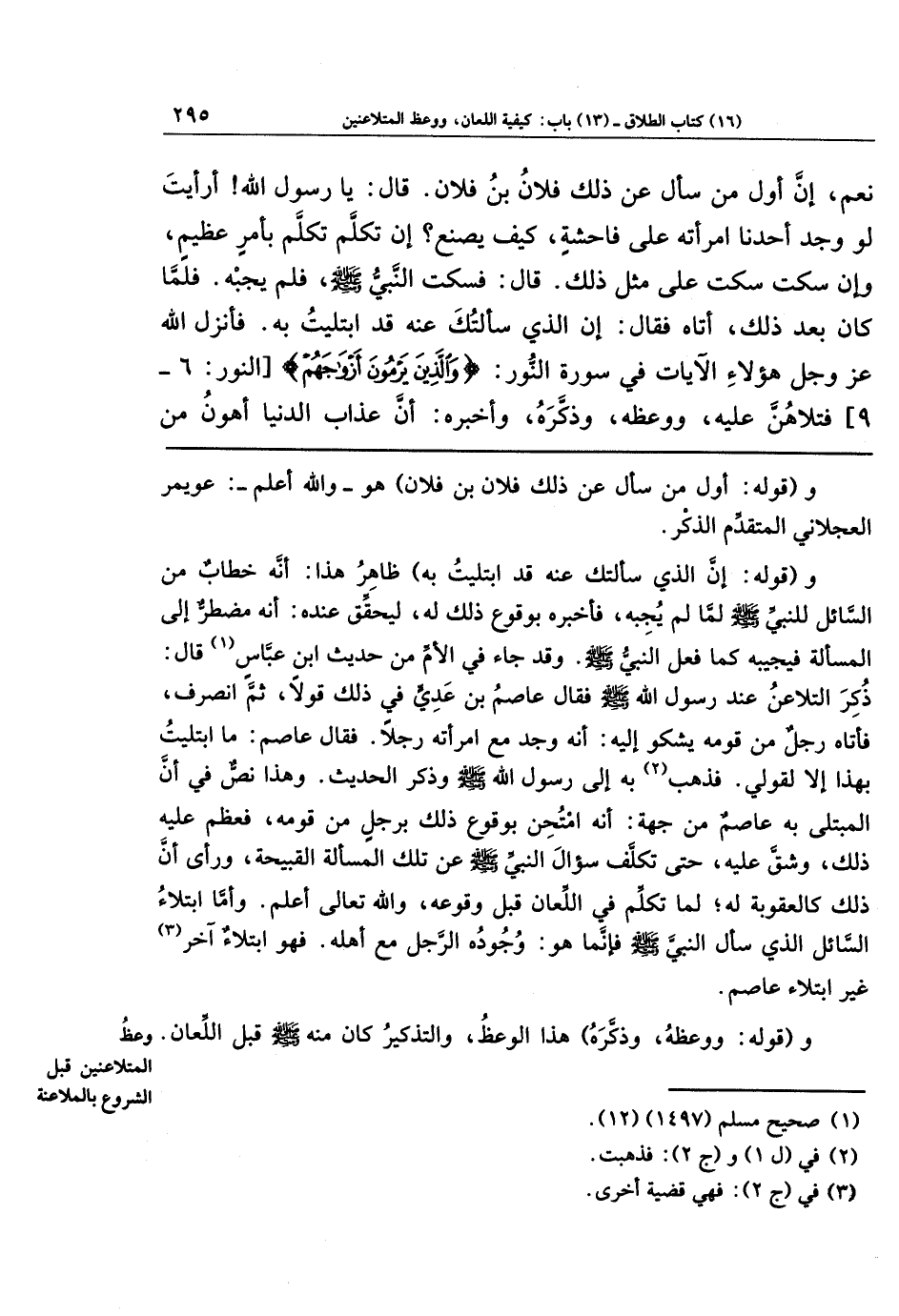 نَعَم إِنَّ أَوَّلَ مَن سَأَلَ عَن ذَلِكَ فُلَانُ بنُ فُلَانٍ، قَالَ: يَا رَسُولَ اللَّهِ أَرَأَيتَ لَو وَجَدَ أَحَدُنَا امرَأَتَهُ عَلَى فَاحِشَةٍ كَيفَ يَصنَعُ؟ إِن تَكَلَّمَ تَكَلَّمَ بِأَمرٍ عَظِيمٍ، وَإِن سَكَتَ سَكَتَ عَلَى مِثلِ ذَلِكَ قَالَ: فَسَكَتَ النَّبِيُّ صَلَّى اللَّهُ عَلَيهِ وَسَلَّمَ فَلَم يُجِبهُ، فَلَمَّا كَانَ بَعدَ ذَلِكَ أَتَاهُ فَقَالَ: إِنَّ الَّذِي سَأَلتُكَ عَنهُ قَد ابتُلِيتُ بِهِ فَأَنزَلَ اللَّهُ عَزَّ وَجَلَّ هَؤُلَاءِ الآيَاتِ فِي سُورَةِ النُّورِ: وَالَّذِينَ يَرمُونَ أَزوَاجَهُم فَتَلَاهُنَّ عَلَيهِ وَوَعَظَهُ، وَذَكَّرَهُ وَأَخبَرَهُ أَنَّ عَذَابَ الدُّنيَا أَهوَنُ مِن