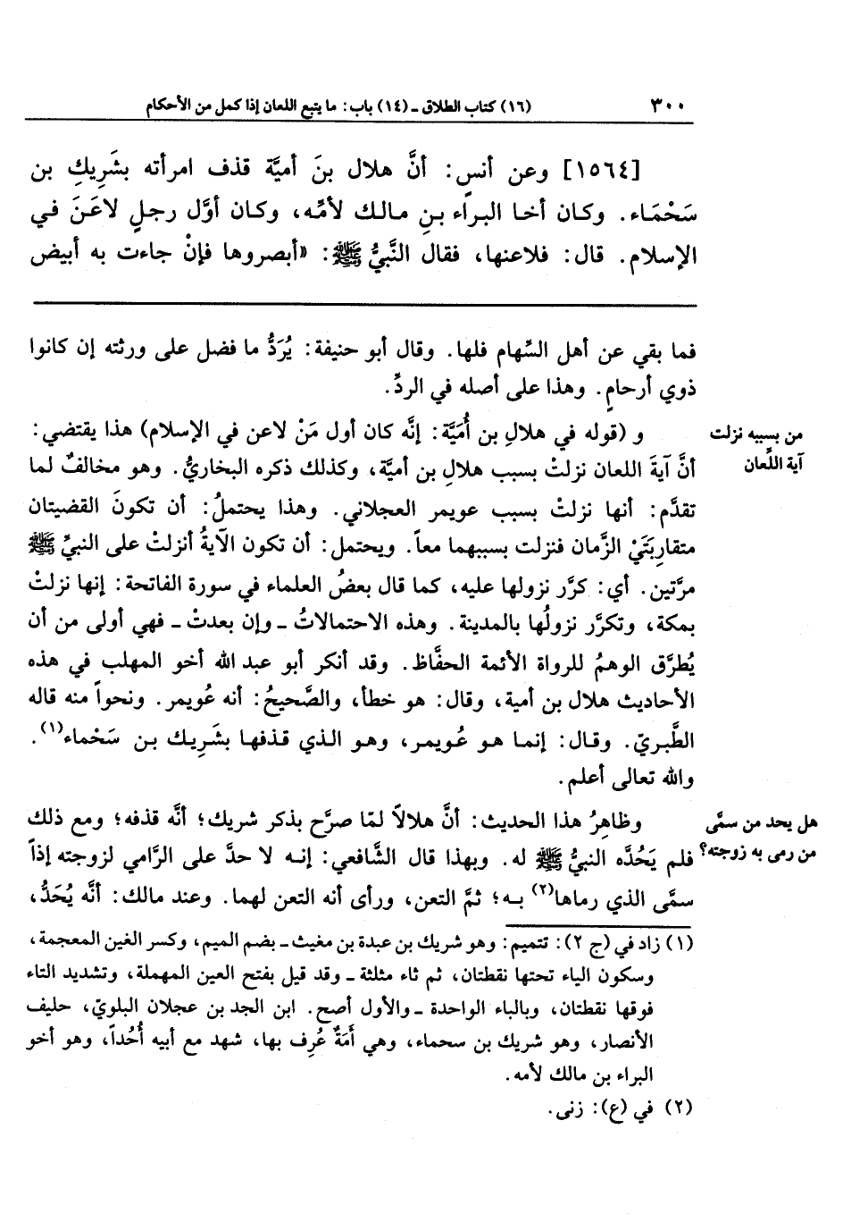 [1564] وعَن أَنَسَ أنَّ هِلَالَ بنَ أُمَيَّةَ قَذَفَ امرَأَتَهُ بِشَرِيكِ بنِ سَحمَاءَ، وَكَانَ أَخَا البَرَاءِ بنِ مَالِكٍ لِأُمِّهِ، وَكَانَ أَوَّلَ رَجُلٍ لَاعَنَ فِي الإِسلَامِ قَالَ: فَلَاعَنَهَا، فَقَالَ النبي صَلَّى اللَّهُ عَلَيهِ وَسَلَّمَ: أَبصِرُوهَا، فَإِن جَاءَت بِهِ أَبيَضَ