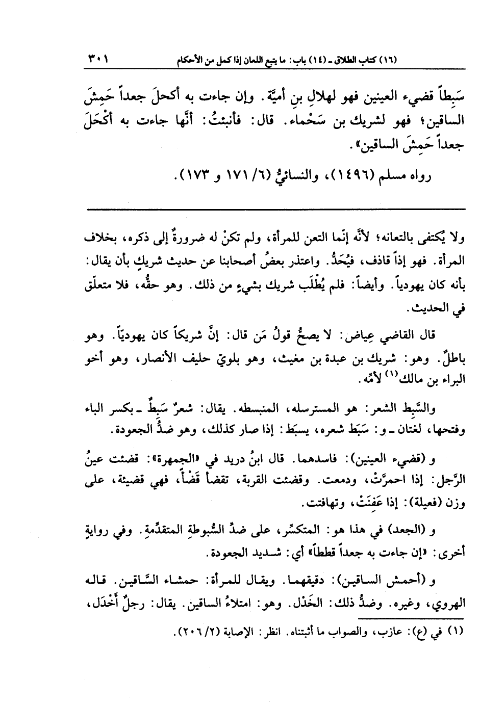 سَبِطًا قَضِيءَ العَينَينِ فَهُوَ لِهِلَالِ بنِ أُمَيَّةَ، وَإِن جَاءَت بِهِ أَكحَلَ جَعدًا حَمشَ السَّاقَينِ فَهُوَ لِشَرِيكِ بنِ سَحمَاءَ قَالَ: فَأُنبِئتُ أَنَّهَا جَاءَت بِهِ أَكحَلَ جَعدًا حَمشَ السَّاقَينِ.