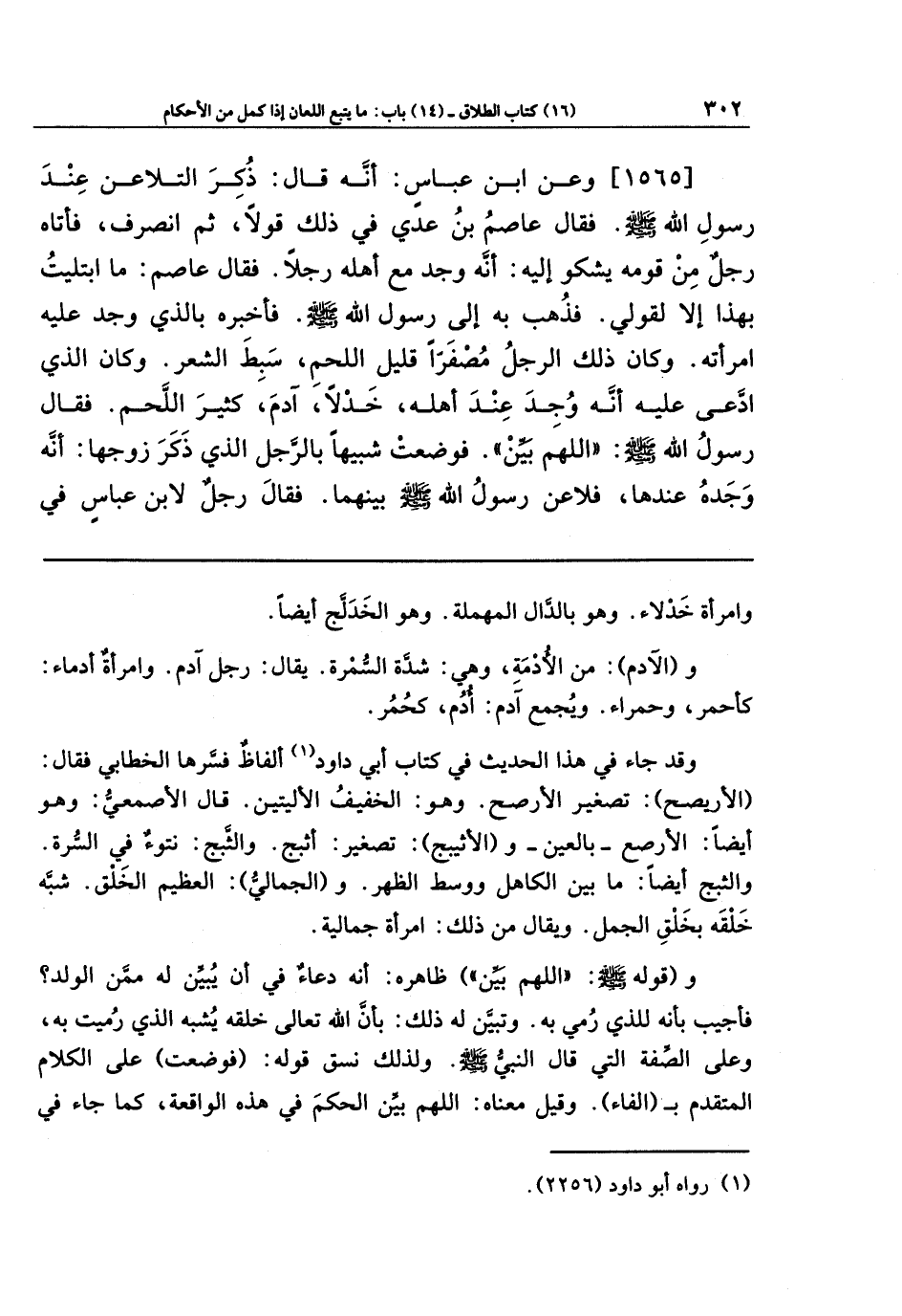 [1565] وعَن ابنِ عَبَّاسٍ أَنَّهُ قَالَ: ذُكِرَ التَّلَاعُنُ عِندَ رَسُولِ اللَّهِ صَلَّى اللَّهُ عَلَيهِ وَسَلَّمَ، فَقَالَ عَاصِمُ بنُ عَدِيٍّ فِي ذَلِكَ قَولًا، ثُمَّ انصَرَفَ، فَأَتَاهُ رَجُلٌ مِن قَومِهِ يَشكُو إِلَيهِ أَنَّهُ وَجَدَ مَعَ أَهلِهِ رَجُلًا. فَقَالَ عَاصِمٌ مَا ابتُلِيتُ بِهَذَا إِلَّا لِقَولِي، فَذَهَبَ بِهِ إِلَى رَسُولِ اللَّهِ صَلَّى اللَّهُ عَلَيهِ وَسَلَّمَ، فَأَخبَرَهُ بِالَّذِي وَجَدَ عَلَيهِ امرَأَتَهُ وَكَانَ ذَلِكَ الرَّجُلُ مُصفَرًّا قَلِيلَ اللَّحمِ سَبِطَ الشَّعَرِ، وَكَانَ الَّذِي ادَّعَى عَلَيهِ أَنَّهُ وَجَدَ عِندَ أَهلِهِ خَدلًا آدَمَ كَثِيرَ اللَّحمِ، فَقَالَ رَسُولُ اللَّهِ صَلَّى اللَّهُ عَلَيهِ وَسَلَّمَ: اللَّهُمَّ بَيِّن فَوَضَعَت شَبِيهًا بِالرَّجُلِ الَّذِي ذَكَرَ زَوجُهَا أَنَّهُ وَجَدَهُ عِندَهَا، فَلَاعَنَ رَسُولُ اللَّهِ صَلَّى اللَّهُ عَلَيهِ وَسَلَّمَ بَينَهُمَا فَقَالَ رَجُلٌ لِابنِ عَبَّاسٍ فِي