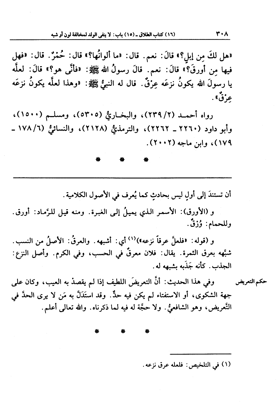 هَل لَكَ مِن إِبِلٍ؟ قَالَ: نَعَم قَالَ: مَا أَلوَانُهَا؟ قَالَ: حُمرٌ قَالَ: فَهَل فِيهَا مِن أَورَقَ؟ قَالَ: نَعَم قَالَ رَسُولُ اللَّهِ صَلَّى اللَّهُ عَلَيهِ وَسَلَّمَ: فَأَنَّى هُوَ؟ قَالَ: لَعَلَّهُ يَا رَسُولَ اللَّهِ يَكُونُ نَزَعَهُ عِرقٌ، قَالَ لَهُ النَّبِيُّ صَلَّى اللَّهُ عَلَيهِ وَسَلَّمَ: وَهَذَا لَعَلَّهُ يَكُونُ نَزَعَهُ عِرقٌ.